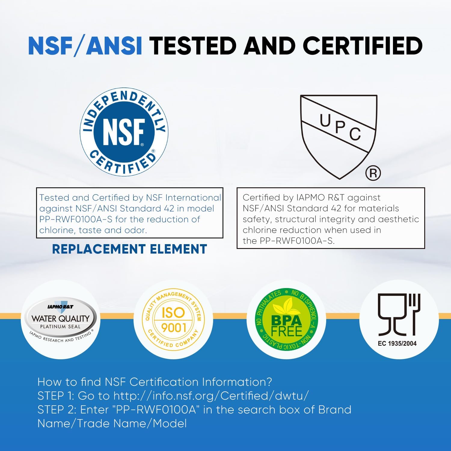 - ❄️Authoritative Certifications - The filter is certified by NSF/ANSI 42 for reducing chlorine, taste, and odor, and NSF/ANSI/CAN 372 for lead-free compliance. It removes 99% of chlorine, enhancing water's taste. It is also certified by Canadian CSA, BPA Free, and Australian Water Mark. Only select products with authoritative certifications for your households.