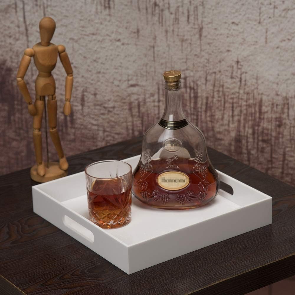 Glossy White Sturdy Acrylic Serving Tray with Handles-12x12Inch-Serving Coffee,Appetizer,Breakfast,Butler-Kitchen Countertop -Cosmetics Organizer-Vanity Table Tray-Ottoman Tray-Decorative