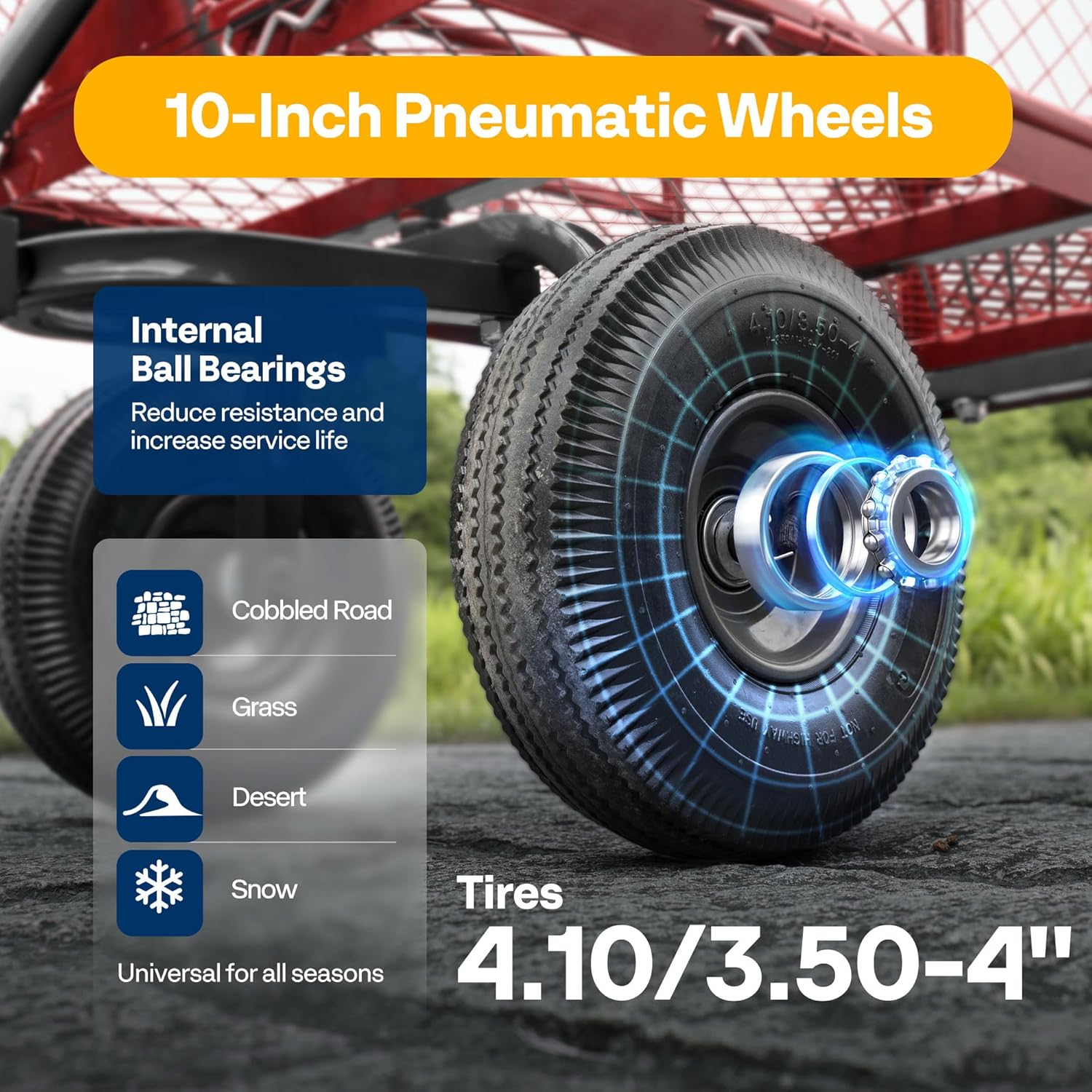 - NOISE REDUCTION TIRES - The load-bearing, shock-absorption, and noise- reduction of the cart are all determined by the casters; The pneumatic tires have good elasticity, impact resistance, and noise reduction; Compared with small wheels, large wheels are able to adapt to various road conditions and have good load carrying advantages; PLEASE BE AWARE that the tires are not fully inflated due to safe transport consideration