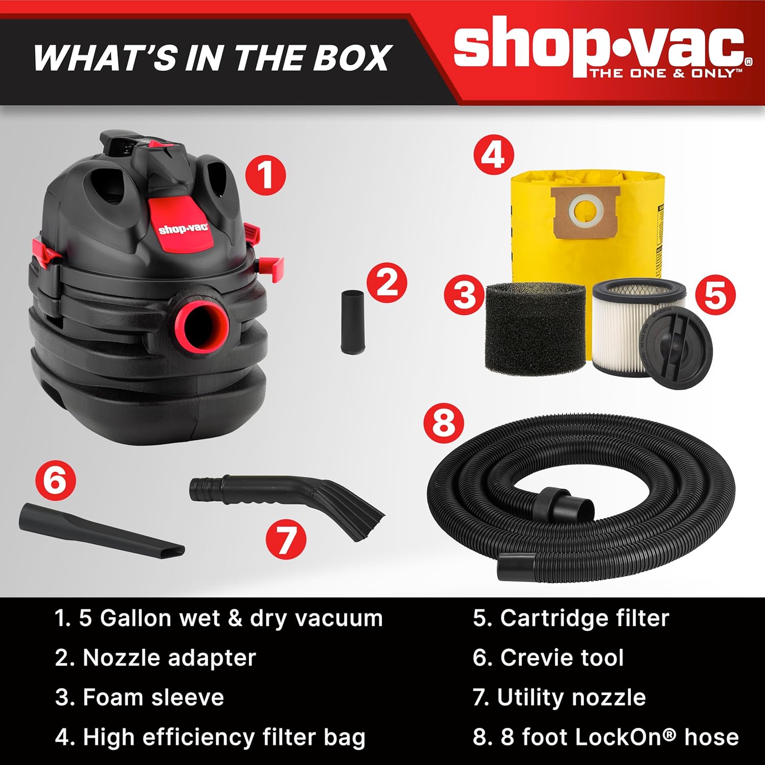 Shop-Vac 5 Gallon 6.0 Peak HP Portable Wet/Dry Vacuum, 1-1/2 Inch Diameter x 8 Foot Hose, 20 Foot Cord, Ideal for Jobsite, Garage, Workshop & Home