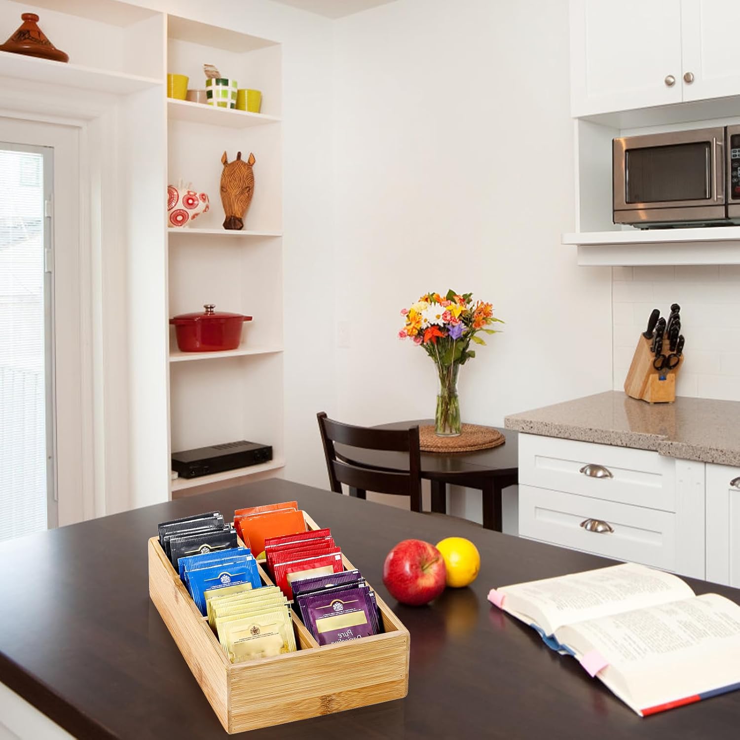 Dicunoy 2 Pack Bamboo Tea Bag Organizers, Wood Tea Bag Storage for Drawers with 6 Roomy Compartments, Sturdy Tea Chest Boxes for Shelf, Coffee Station, Sugar Packet, Sweeteners, Small Packets