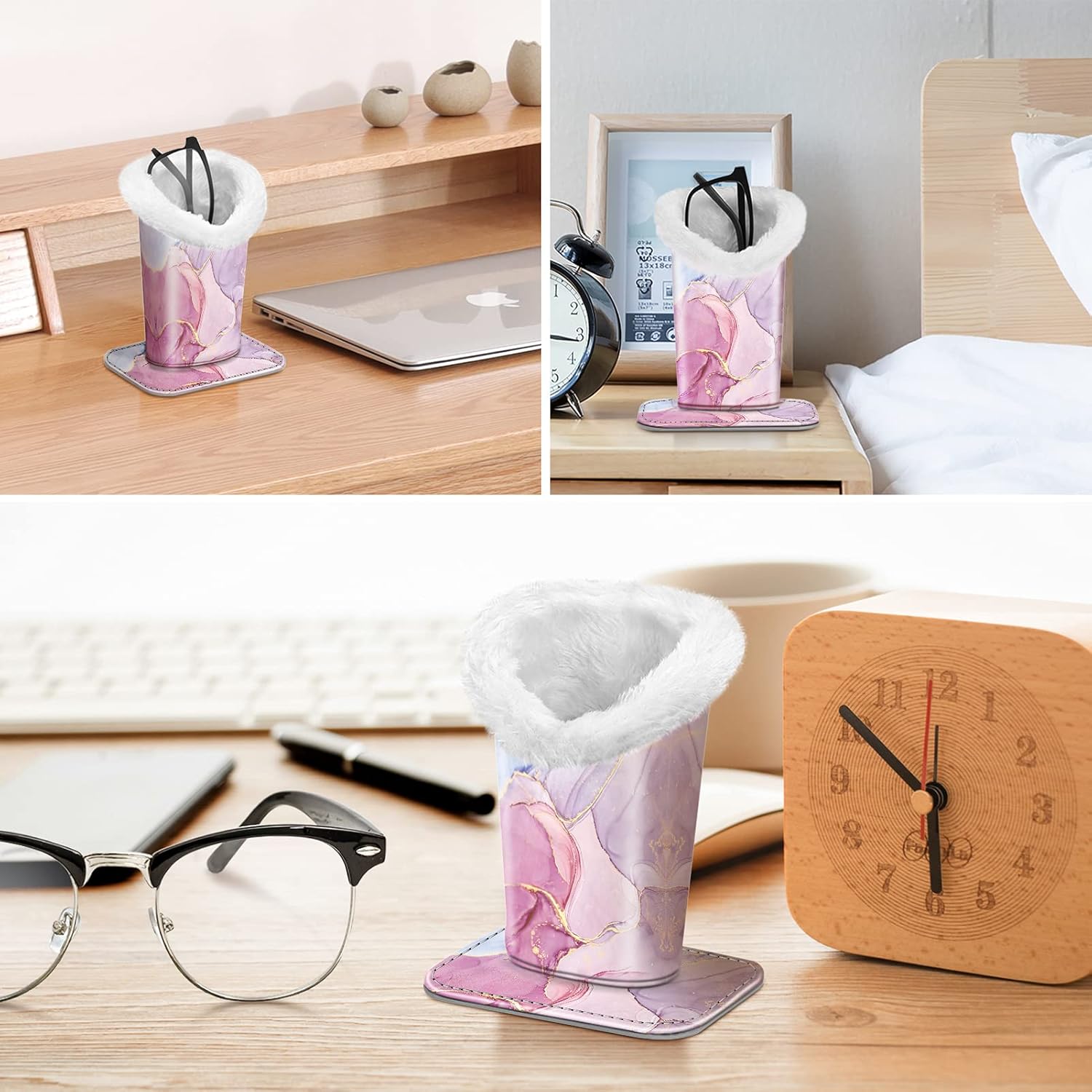 - Featured in Flat wide base design, it is easy to place on any surface (nightstand, kitchen counter, computer desk, office, bathroom), and your endless search of locating your missing glasses is over! No more frustration, no more panic