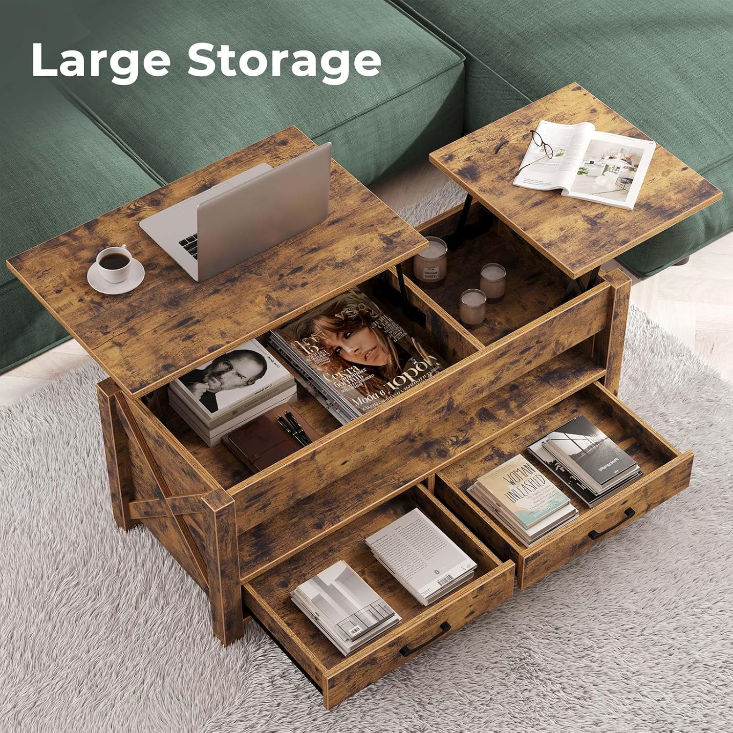 Seventable Coffee Table, 47.2" Lift Top Coffee Table with 2 Storage Drawers and Hidden Compartment, Farmhouse Center Table with Wooden Lift Tabletop, for Living Room,Rustic Brown