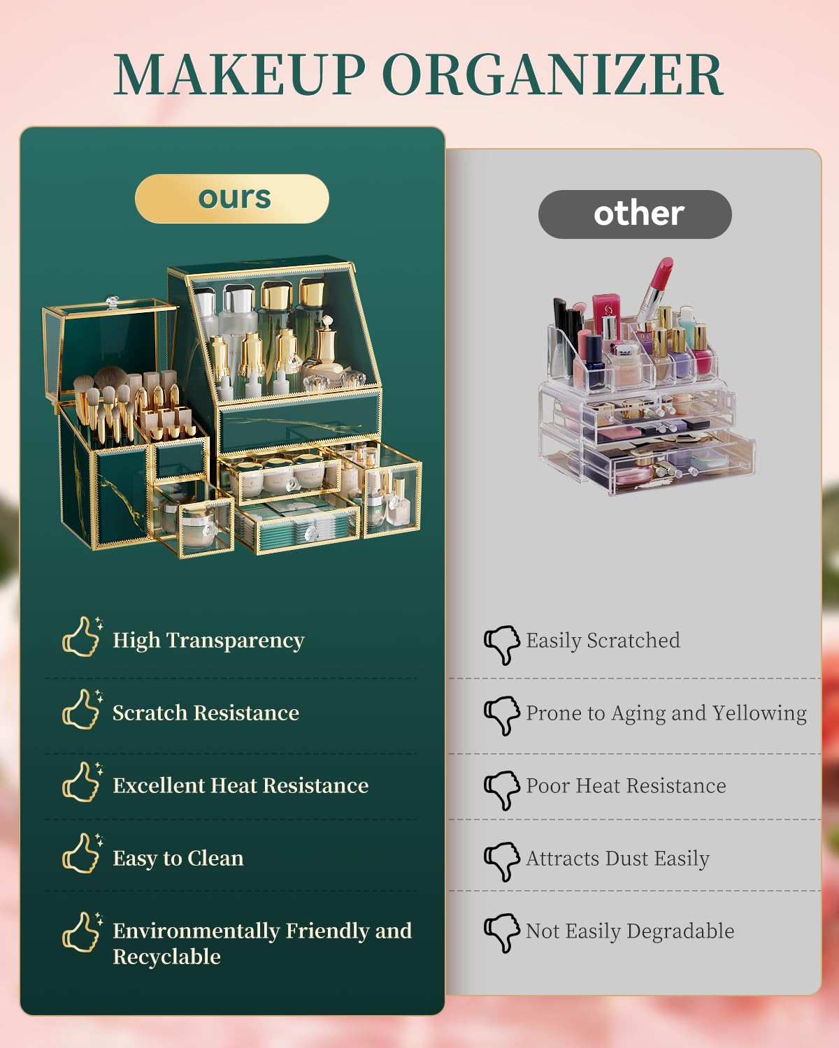 - Elegant Green Glass Design with Calm Luxury:Crafted from premium glass with a soft green tint, this green makeup organizer adds natural elegance to any vanity or bathroom counter.
