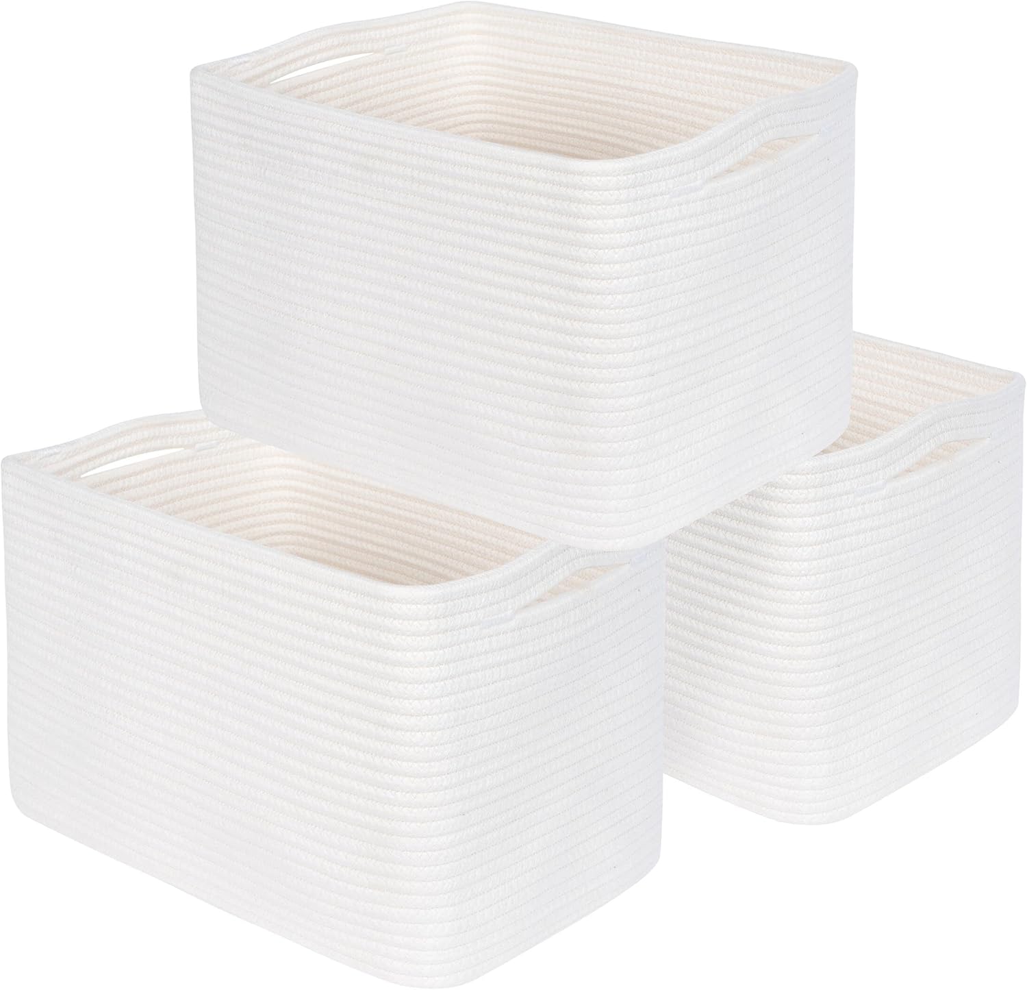 - Well-Sized Bins with Elegant Slit Handles - Set of Three (3) Basket Bins: 15" (L) x 10" (W) x 10" (H). Our baskets are handmade with flexible material, which may result in slight size variations. Measurements should be taken from the center of each side to the center of the opposite side after the bins are fully unfolded & expanded. Taking measurements along just one side or when it is folded may result in smaller measurements due to the rounded corners and folding.