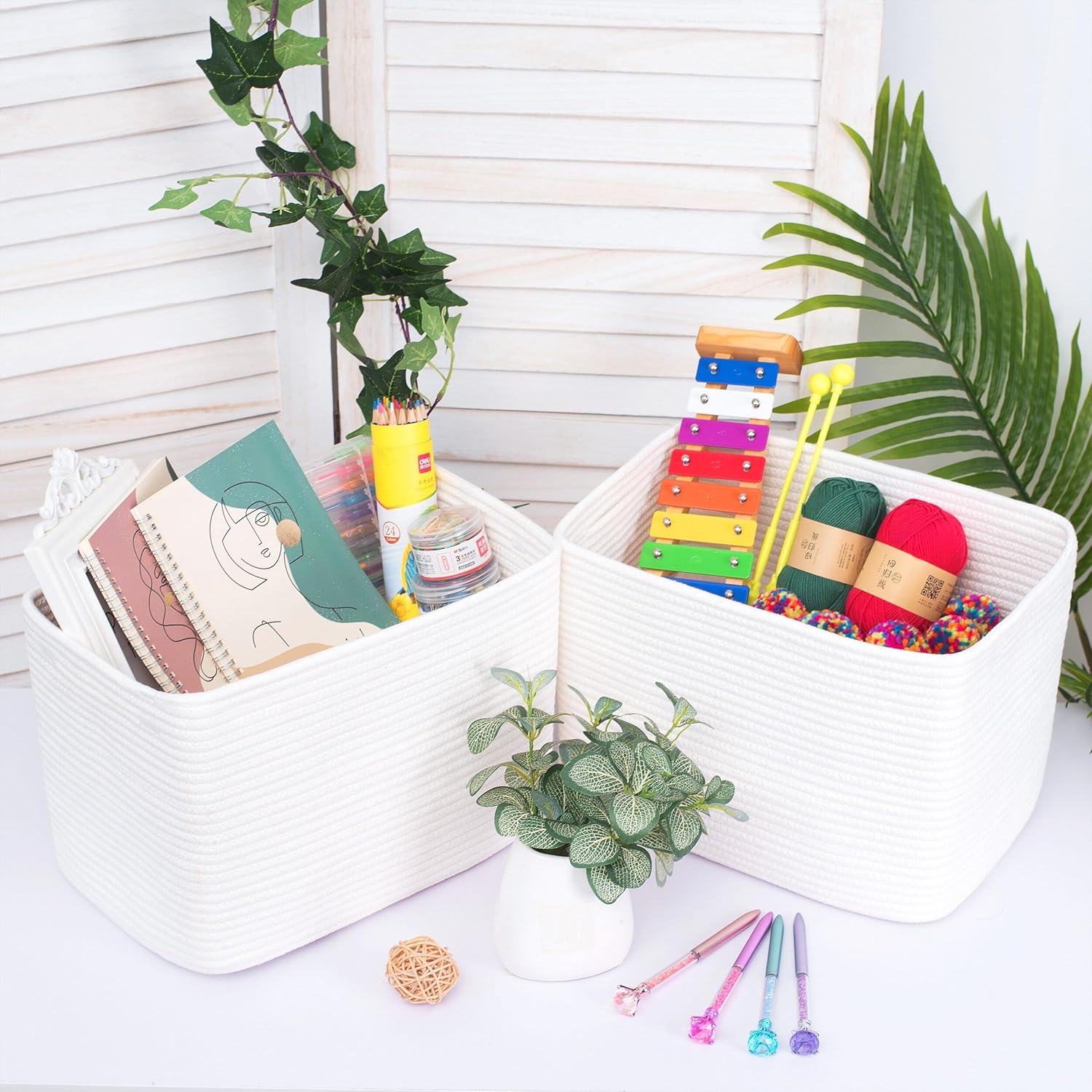 - Decorative Cute Woven Baskets - A stylish and practical way to create eye-catching table and counter-top displays. Not only will our basket set help you get organized, but their sleek, sophisticated shape and neutral color will complement any decor. Put them on a nightstand, a bedside table, a nursery side table, walk-in closet, shelves, kitchen countertop, or bathroom vanity top to add character to your rooms while keeping everything organized.