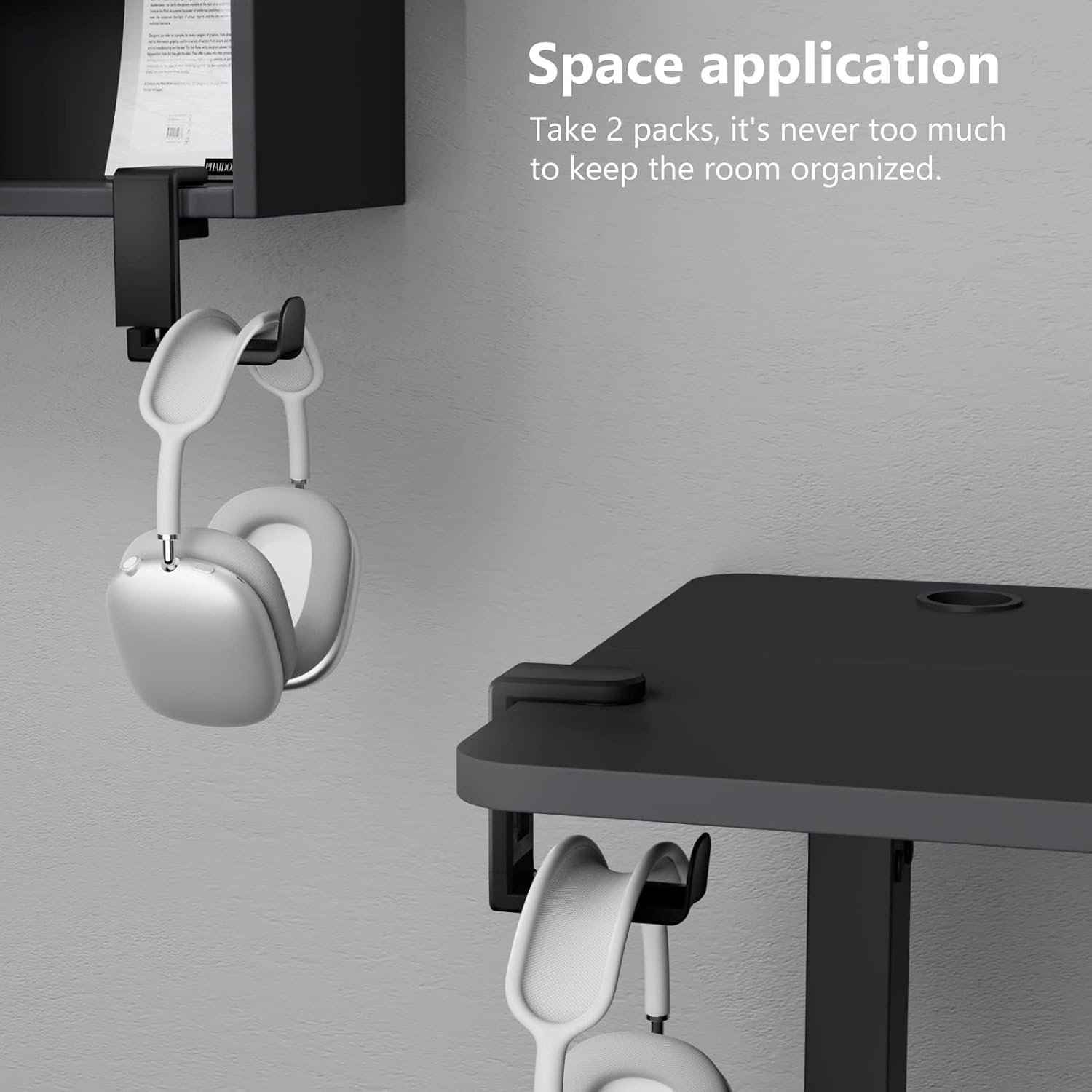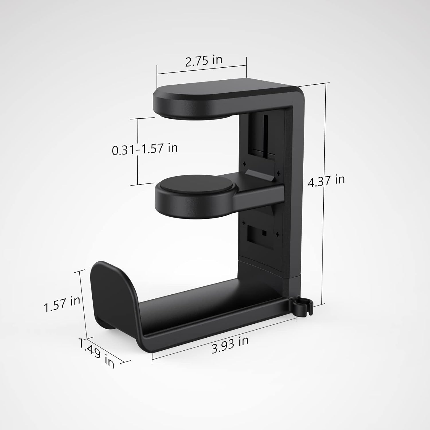 - ăClamp-on Headphone StandăThe E-Hold Series headphone holder fits desks from 0.31 inch to 1.57 inch thick, making it a versatile choice for most setups. The spring clamp is a breeze to remove and reattach. No glue, no mess. It blends seamlessly into your space, whether it's your desk, shelf, or other surface.