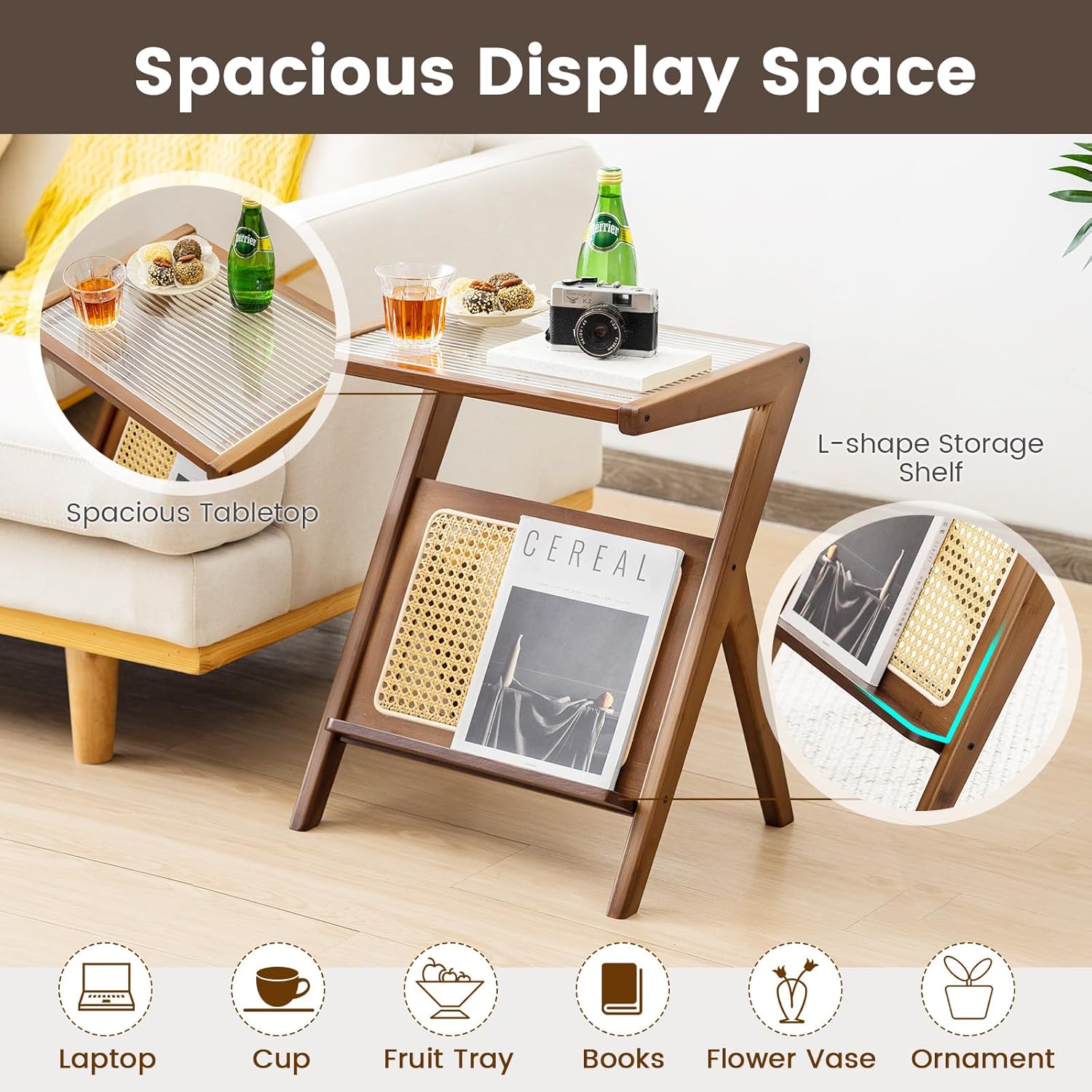 - Spacious Storage Space: The rattan side table is designed with a spacious tabletop and L-shape storage shelf, providing large storage spaces to keep laptop, cup, fruit tray, books, flower vase, ornament in order. The open design is perfect for showing and easy fetching.