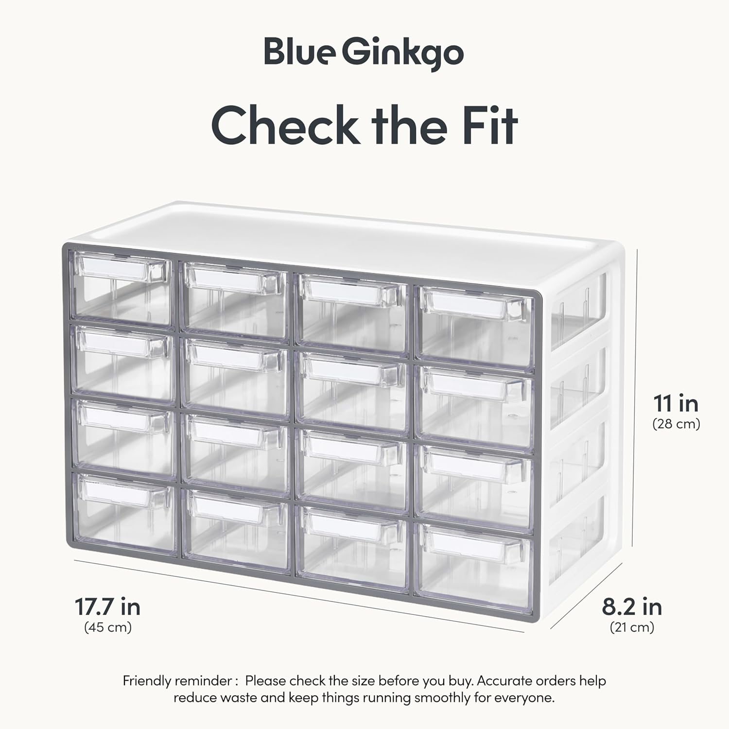 - Size - Dimensions of the 16 drawer organizer storage unit: Overall Unit: [H11 x D8.2 x W17.7 inches] Each Drawer: [H2.1 x D7.2 x W3.7 inches].