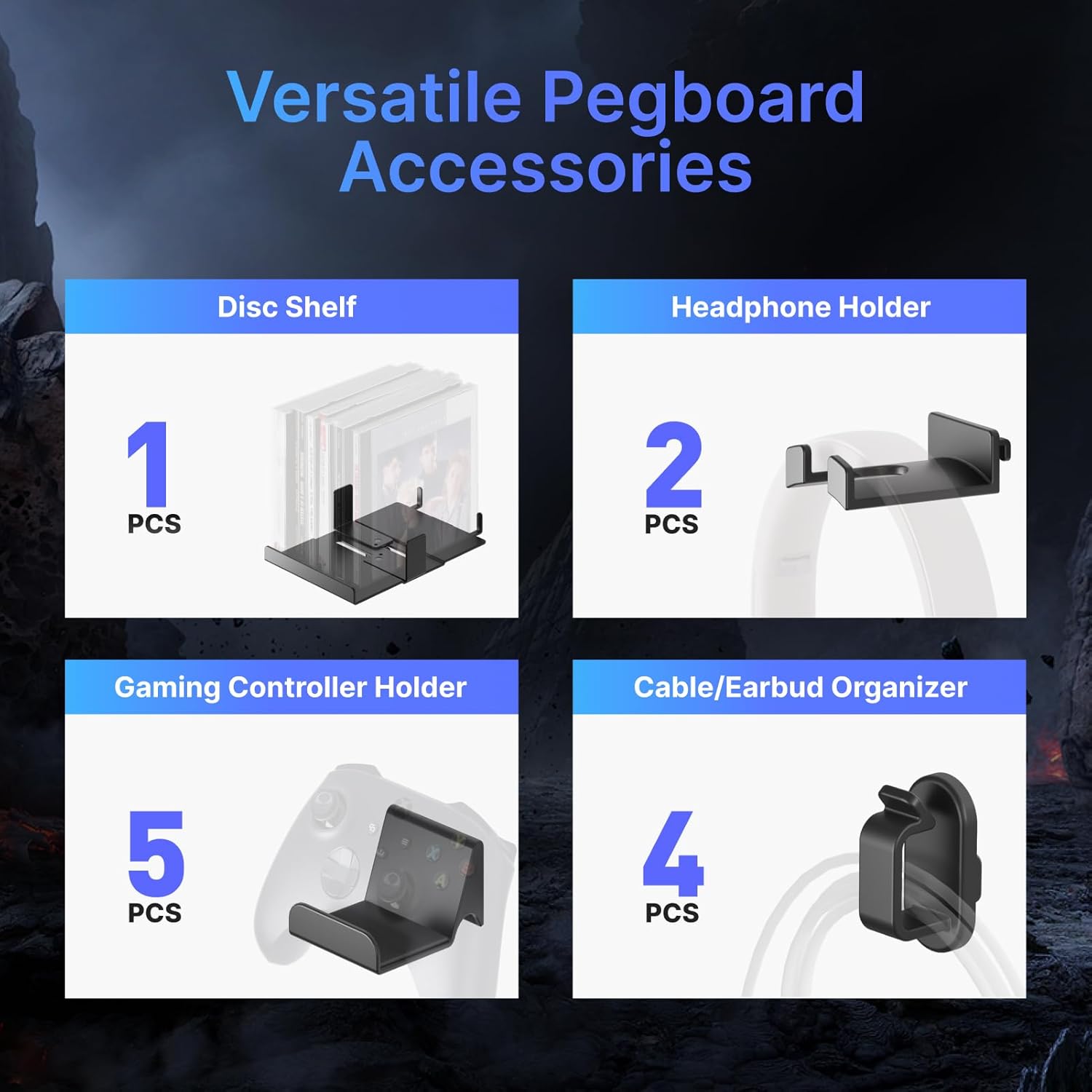 - Pro-Level Accessory Kit: Includes wall mount controller holders, headphone racks, cable hooks, and adjustable disc shelves. The wall mounted pegboard is compatible with PS5, PS4, Xbox, and Nintendo controllers, keeping your gear safe and ready for action.
