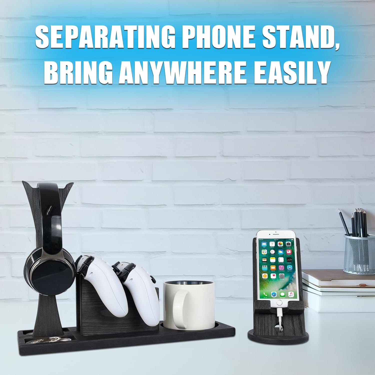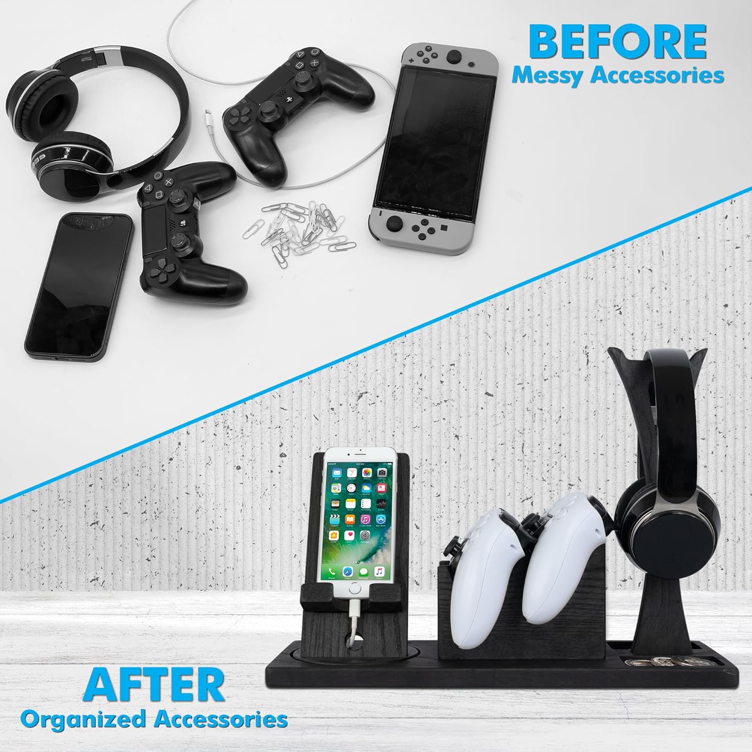- Wide Compatibility, Easy to Use: Our Game controller is suitable to use with most gaming consoles and PCs. Itβs compatible with PS4 Controller, PS5 Controller, One and Series X Controller, Nintendo Switch, Fire TV Game Controller, and many more. The headphone hanger is also compatible with all kinds of headsets, gaming headsets. The assembly steps are attached to the back of the box. You can quickly assemble your walnut wood controller organizer according to the instructions.