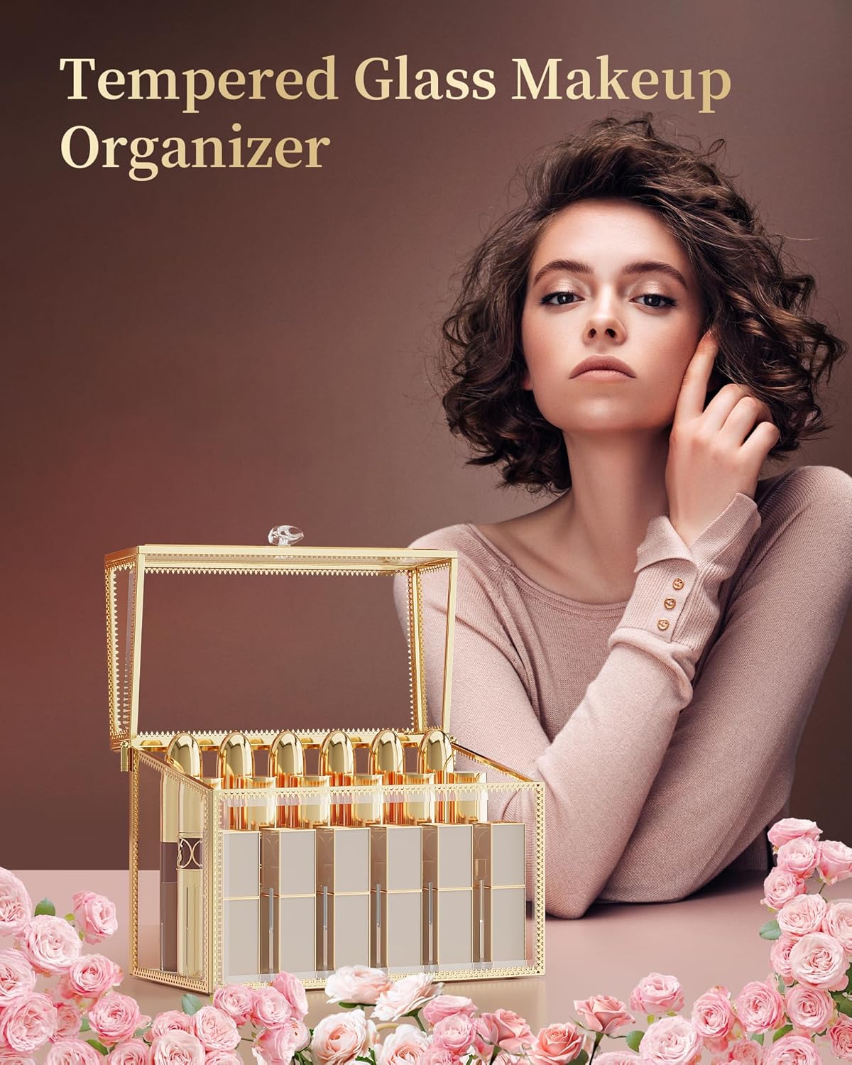 Lipstick Organizer,Luxury Tempered Glass Lipstick Holder & Nail Polish Organizer, 18-Slot Vanity Cosmetic Organizer with Removable Dividers, Gold