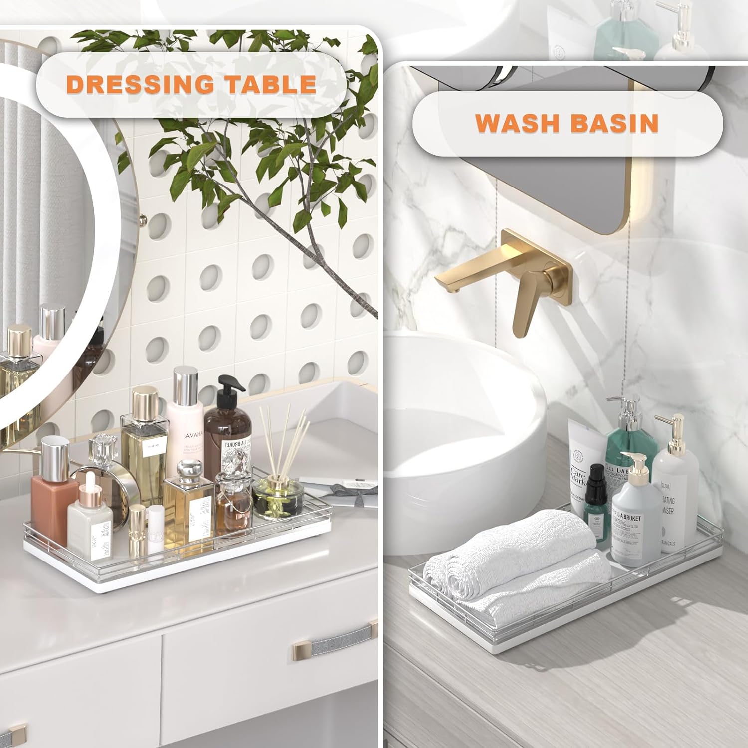 - Considerate Design: This bathroom trays for counter is ready to use without any installation required; Upgraded embedded welding design enhances stability and aesthetics; Raised edge prevent items from slipping; 4 non-slip pads on the bottom protect surfaces from scratches; Simplify your cleaning routine with just a quick wipe-down using a damp cloth, saving you time and hassle