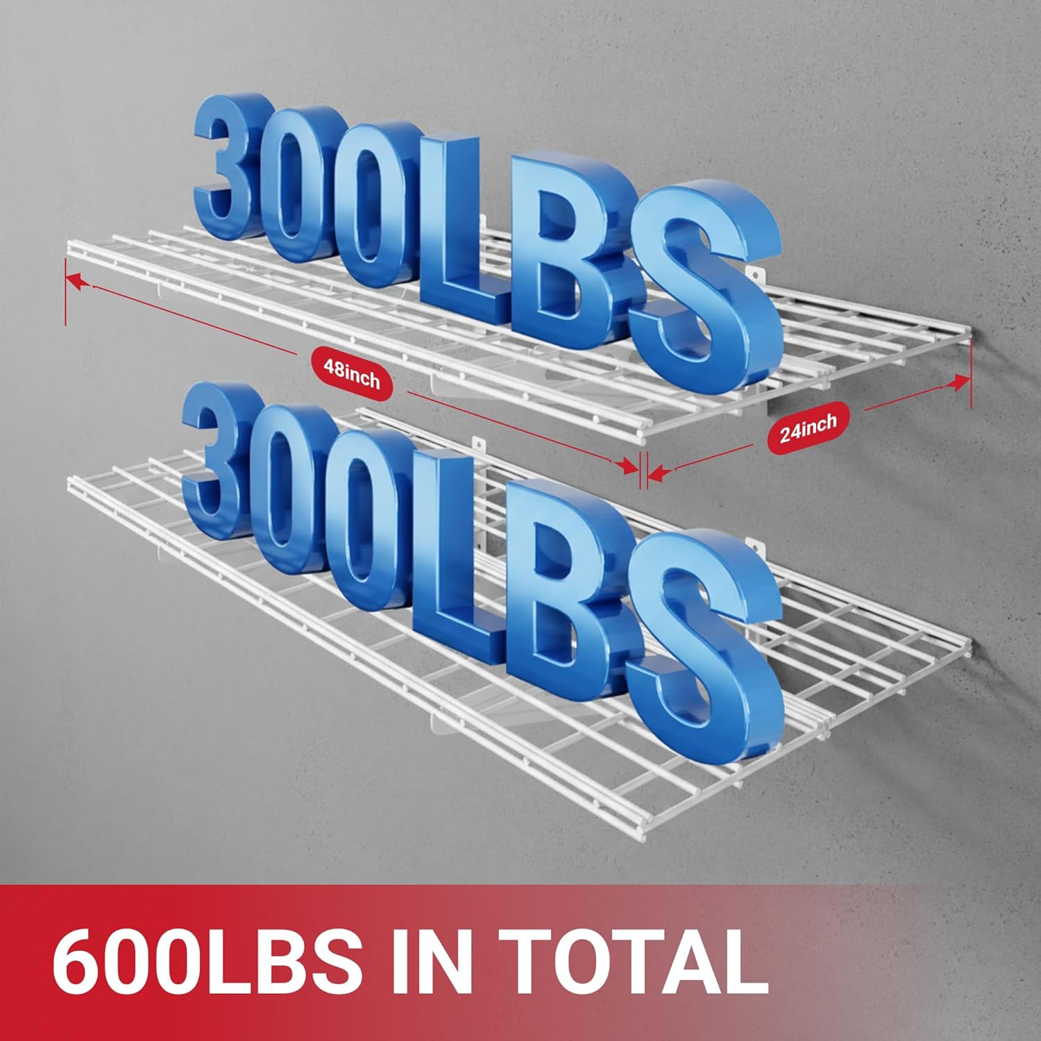 - High Load Capacity: The shelving can safely hold a total load of 600 lbs (300 lbs per tier). Each hook can safely hold 50 lbs.