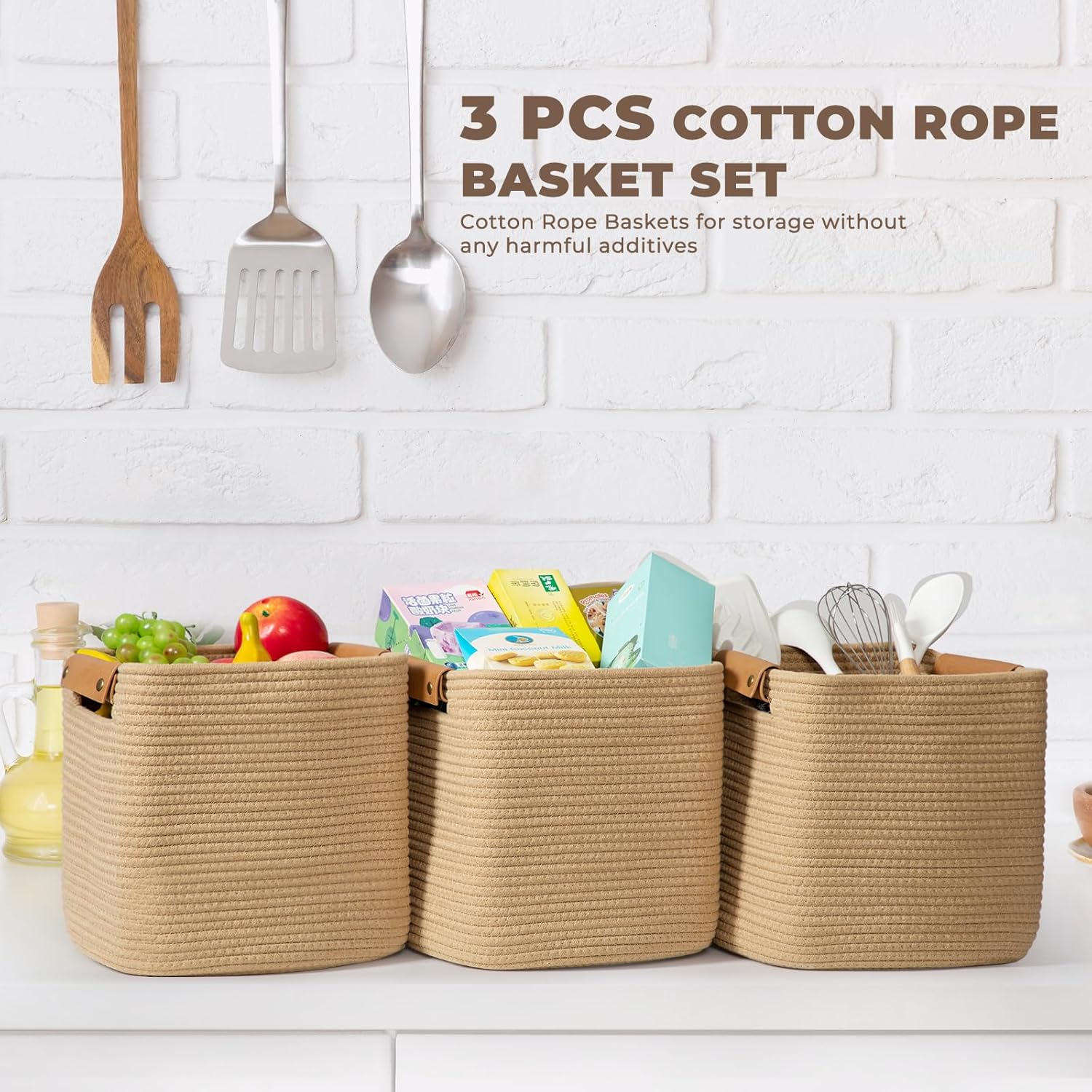 danpinera 3 Pack 11 Inch Woven Baskets for Storage, Stylish Storage Baskets for Shelves, Laundry, Bathroom, Kitchen, Cube Storage Bin, Cotton Rope Boho Baskets, Jute