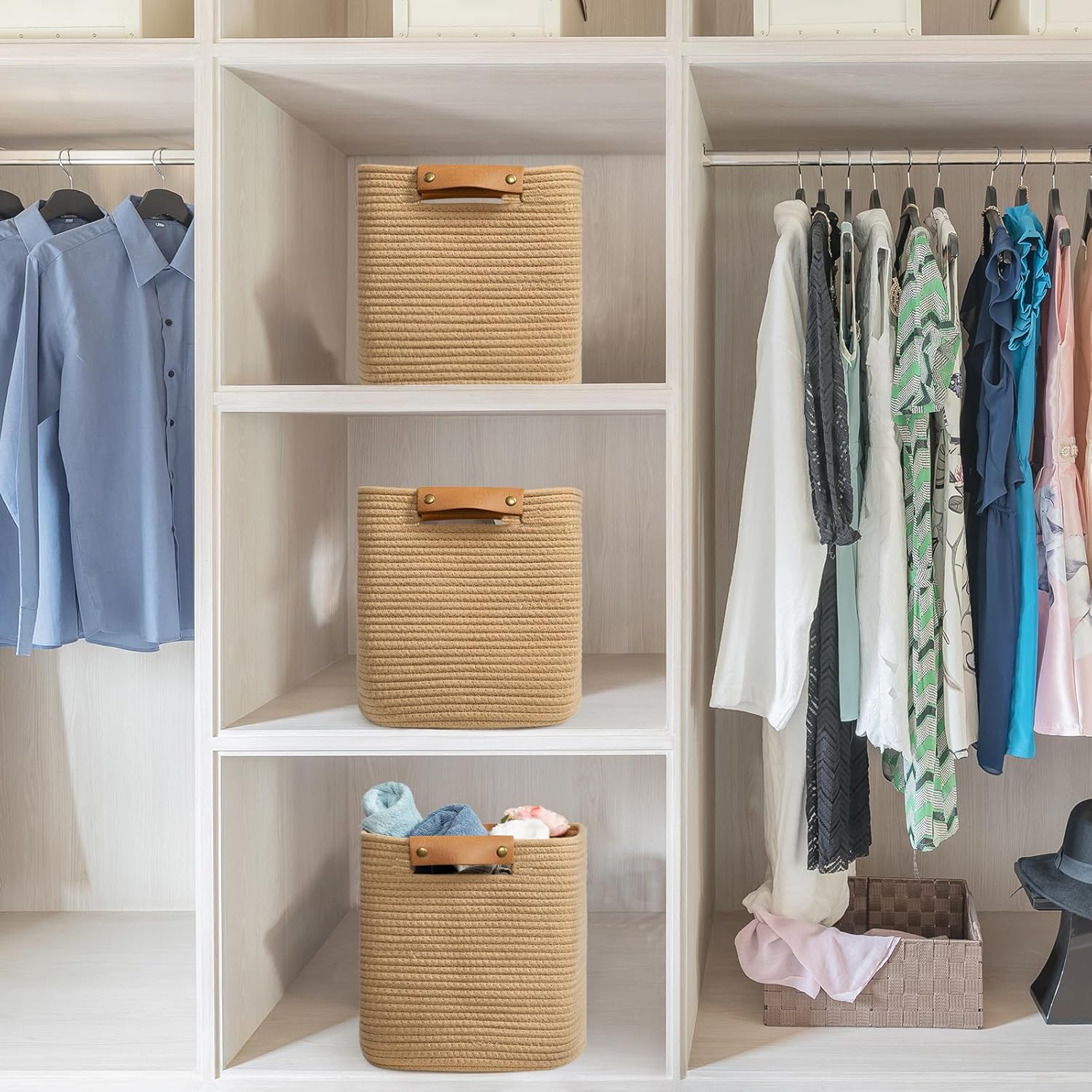 - Modern Charm: The storage cubes feature leather handles that provide comfortable grip for easy carrying. Woven storage bins are made of 100% cotton to ensure long lasting use. The contrast between the cotton and leather creates a stylish and modern look