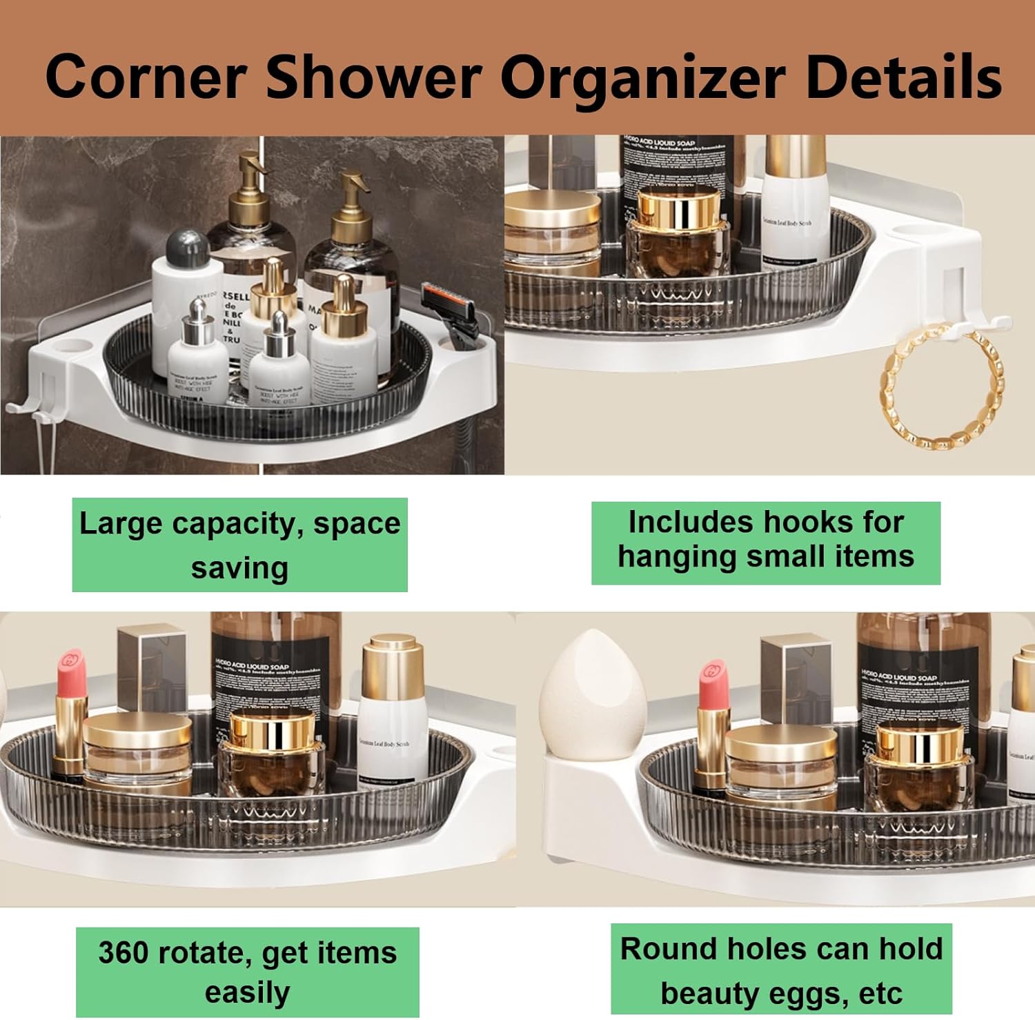- Corner shower rack with hooks for hanging small items such as bracelet, or bath ball, and the round holes can hold beauty eggs, comb, etc. It can be used to store basic cosmetics, perfume, lipstick, skincare products, makeup powder and sunscreen cream, as well as facial cleanser and other toiletries