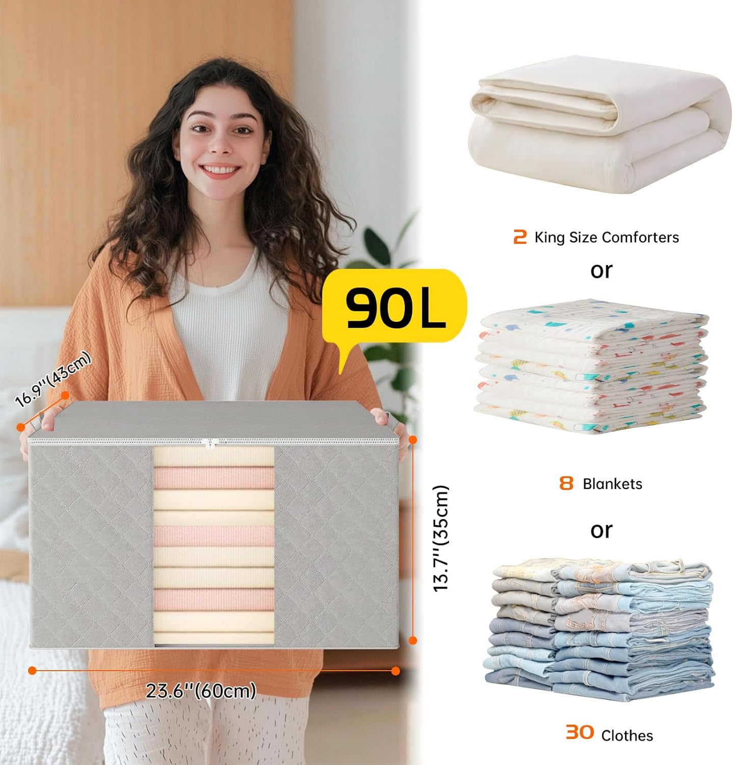 - Premium Quality and Spacious: These 90L large clothes storage bags are expertly crafted from premium materials, ensuring they are waterproof and tear-resistant for long-lasting durability. With a generous 90L capacity, they offer ample storage space for clothing, blankets, toys, and more, effectively decluttering and organizing your living space.
