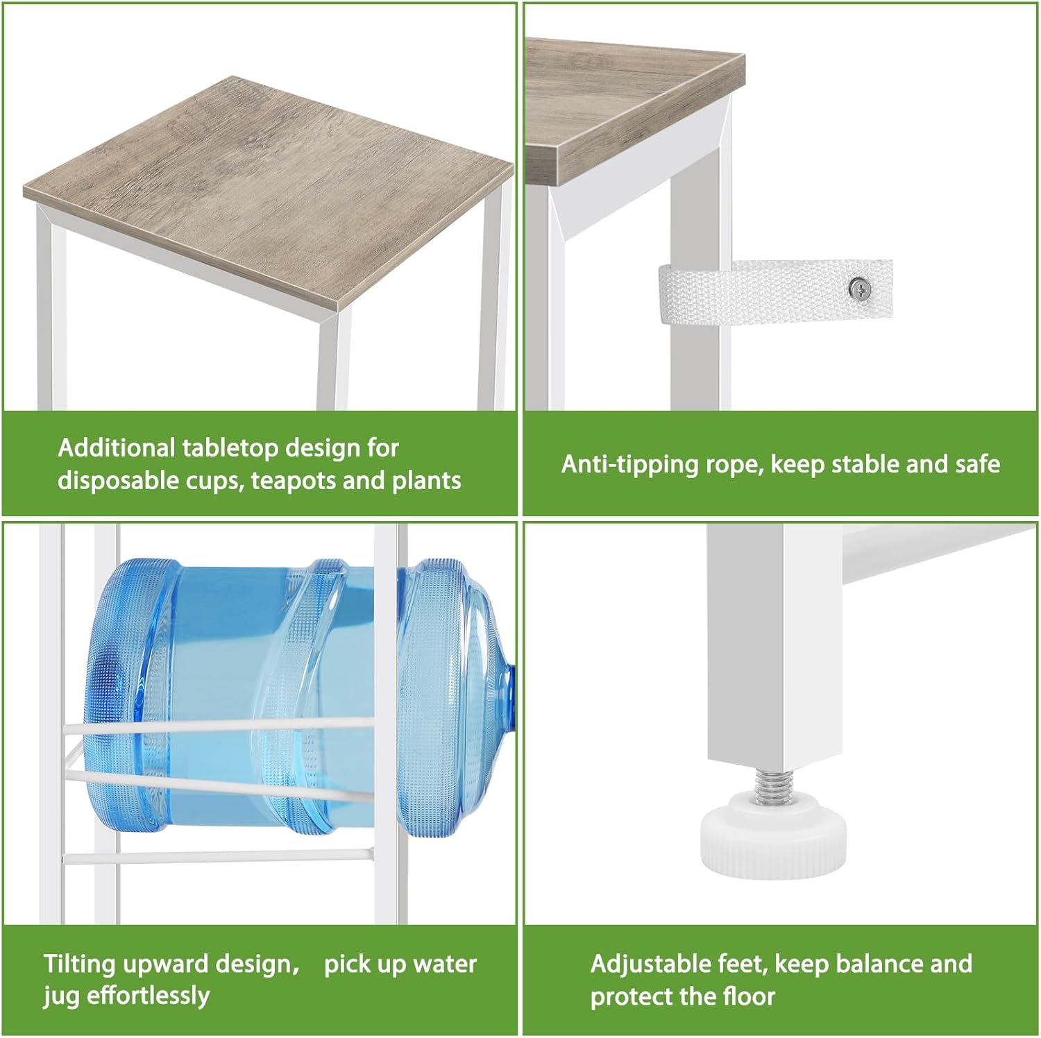 - 【Extra Top Shelf】: The tabletop of 5 gallon water jug rack can support water bottles, coffee tea cups, potted plants, etc. Not only practical, but also can decorate your home. Featuring a 20° tilt design, you can easily take and store the water bottles