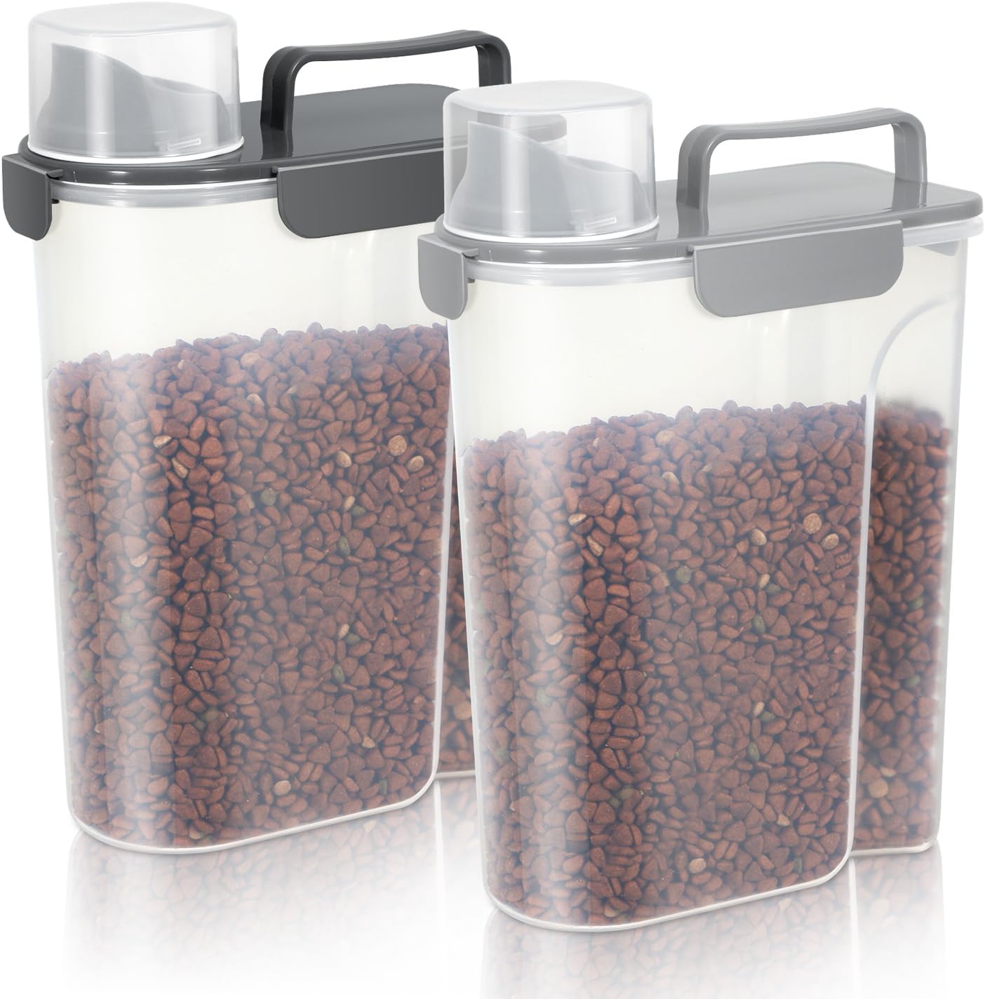 Cat Dog Food Storage Container, Upgraded Large Nozzle,5LBS Plastic Pet Food Storage Container, With 4 Sealed Clasps, 1 Measuring Cup and Handle, Easy to Clean and Carry -2 Pcs Light Gray + Dark Gray