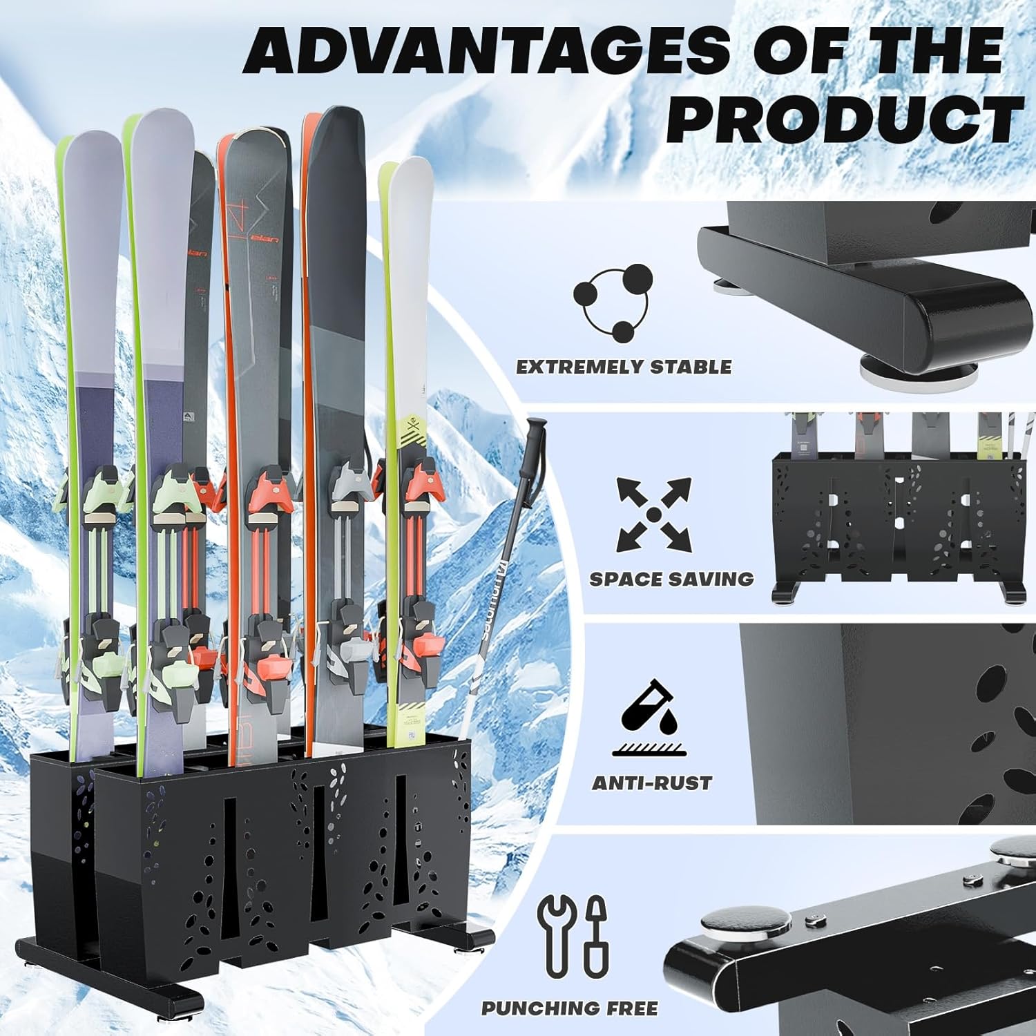 - Heavy-Duty Construction: Ski rack built from high-quality, heavy-duty steel , this freestanding ski storage rack is designed to withstand the weight of multiple skis, snowboards, and poles, ensuring long-lasting durability while keeping your skis organized.