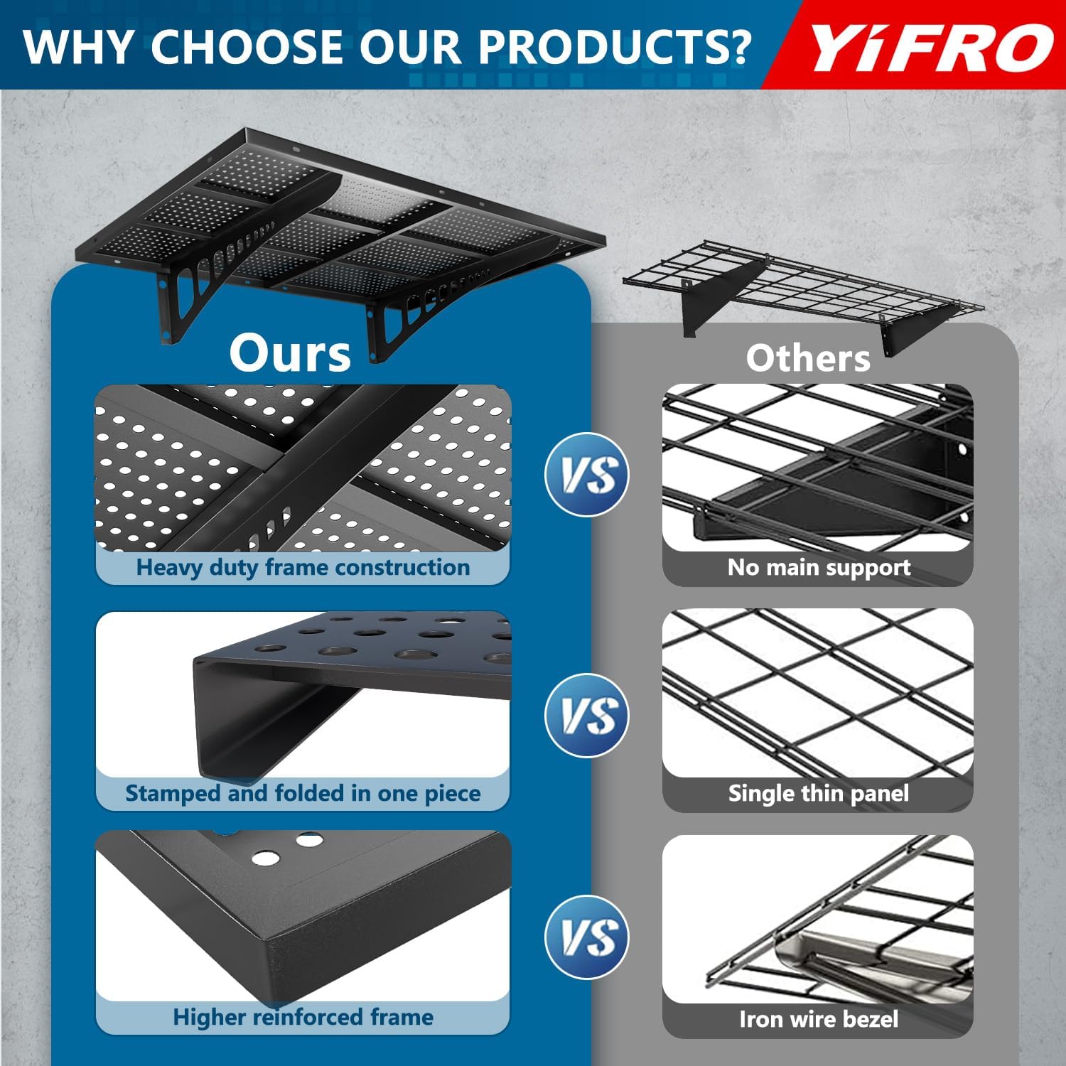- HEAVY DUTY CONSTRUCTION: YIFRO garage wall shelving takes its cues from architectural frame construction, with a 1.5x4 ft individual bracket load capacity of 250 lbs. and a total of 1000 lbs. for 4 shelves, which makes it easy to store most of the items in your garage.
