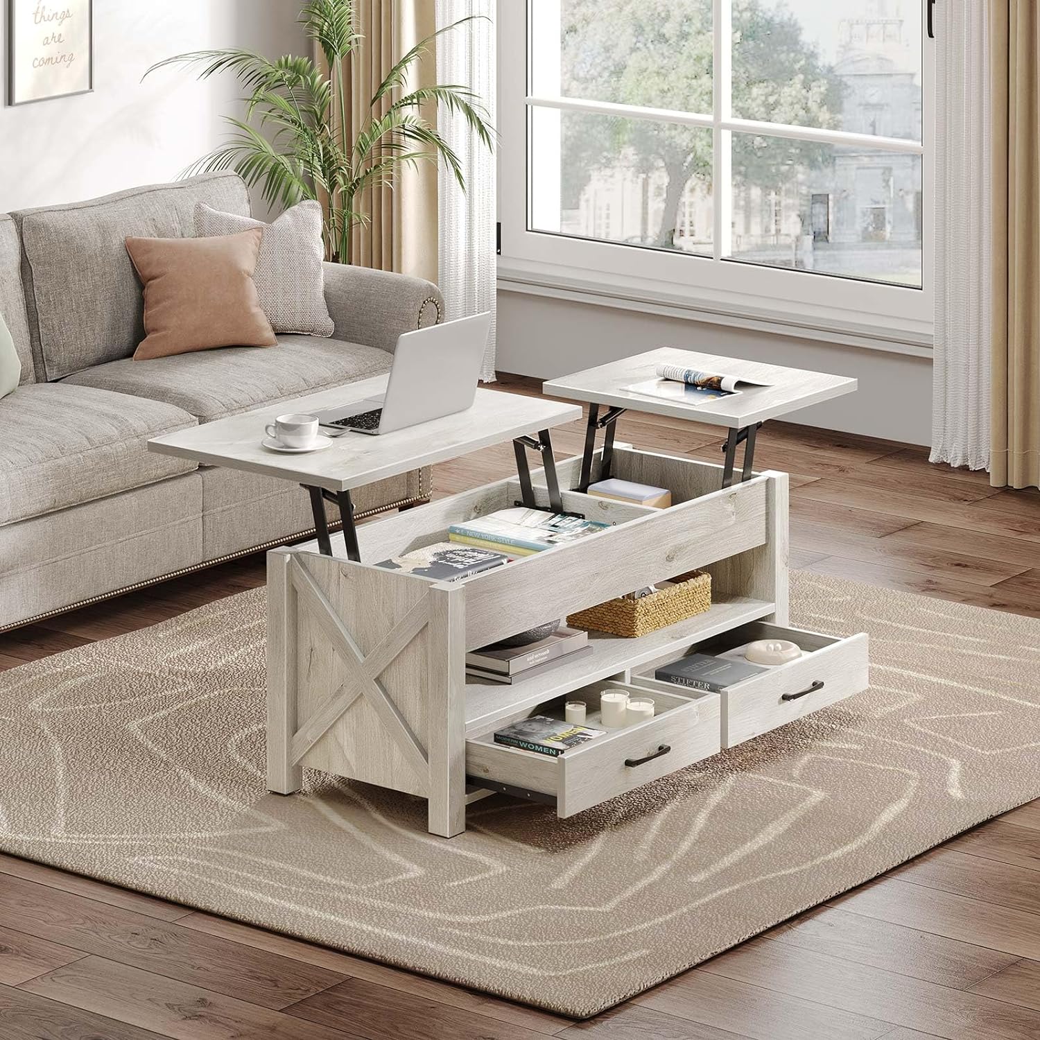 - Two-Way Lift Top Design: This unique coffee table features a one-of-a-kind design that allows the split top to lift in two places and move forward, creating two multipurpose workspaces. This allows you and your family to use the table separately without interruption. The largest tabletop can be assembled on either the left or right side to suit different sofas