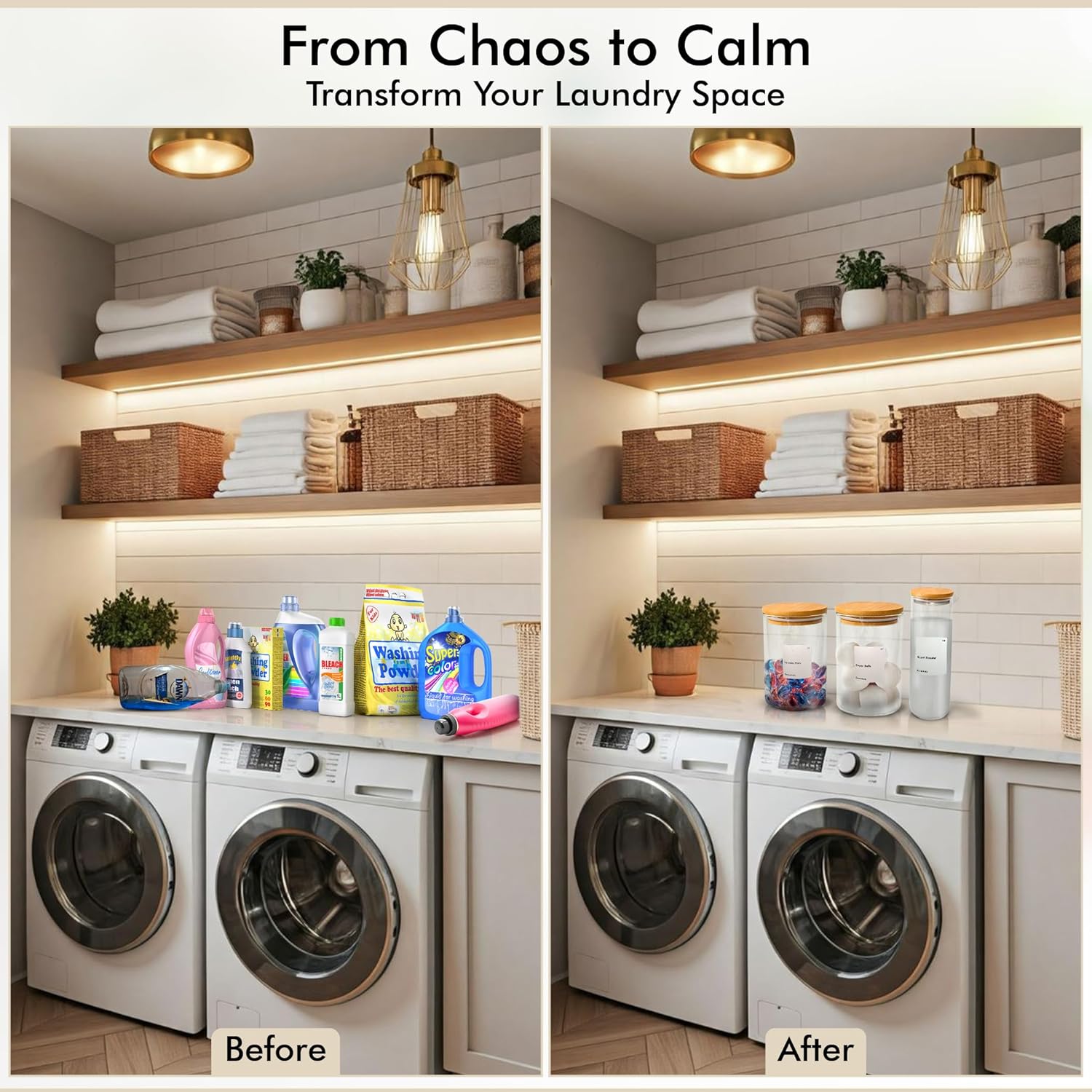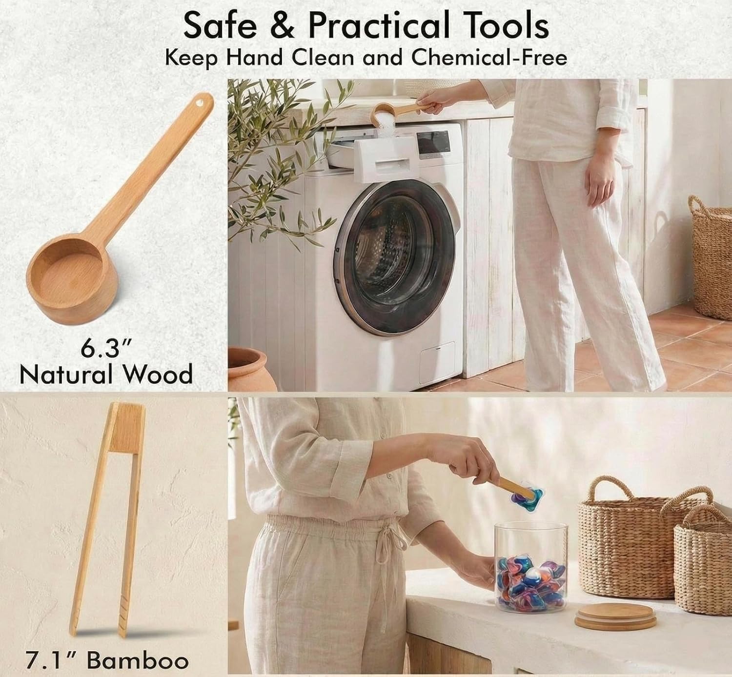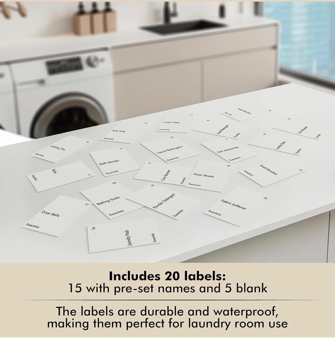- CUSTOM LABELS & BAMBOO ACCESSORIES INCLUDED: Enhance your organization with 15 waterproof, pre-printed laundry labels (Detergent, Fabric Softener, Bleach, etc.) plus 5 blank labels for full customization. This set also includes a premium bamboo scoop and tongs for clean, mess-free handling of laundry products.
