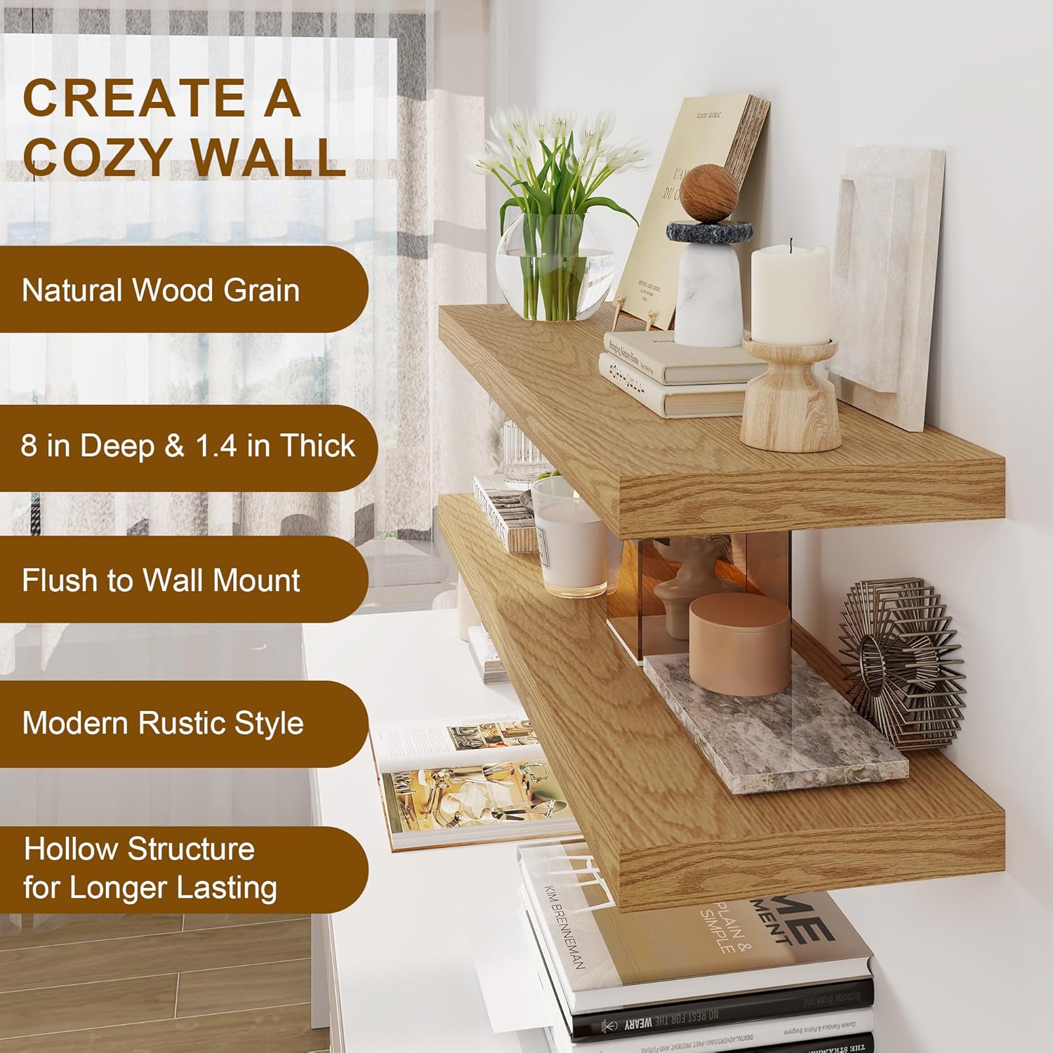 30 Inch Floating Shelves, Rustic Floating Wall Shelves 8 Inch Deep, 30 x 8 Floating Shelves for Home Decor, Deep Display & Storage Shelves for Kitchen, Bathroom, Living Room, Oak Color, Set of 2