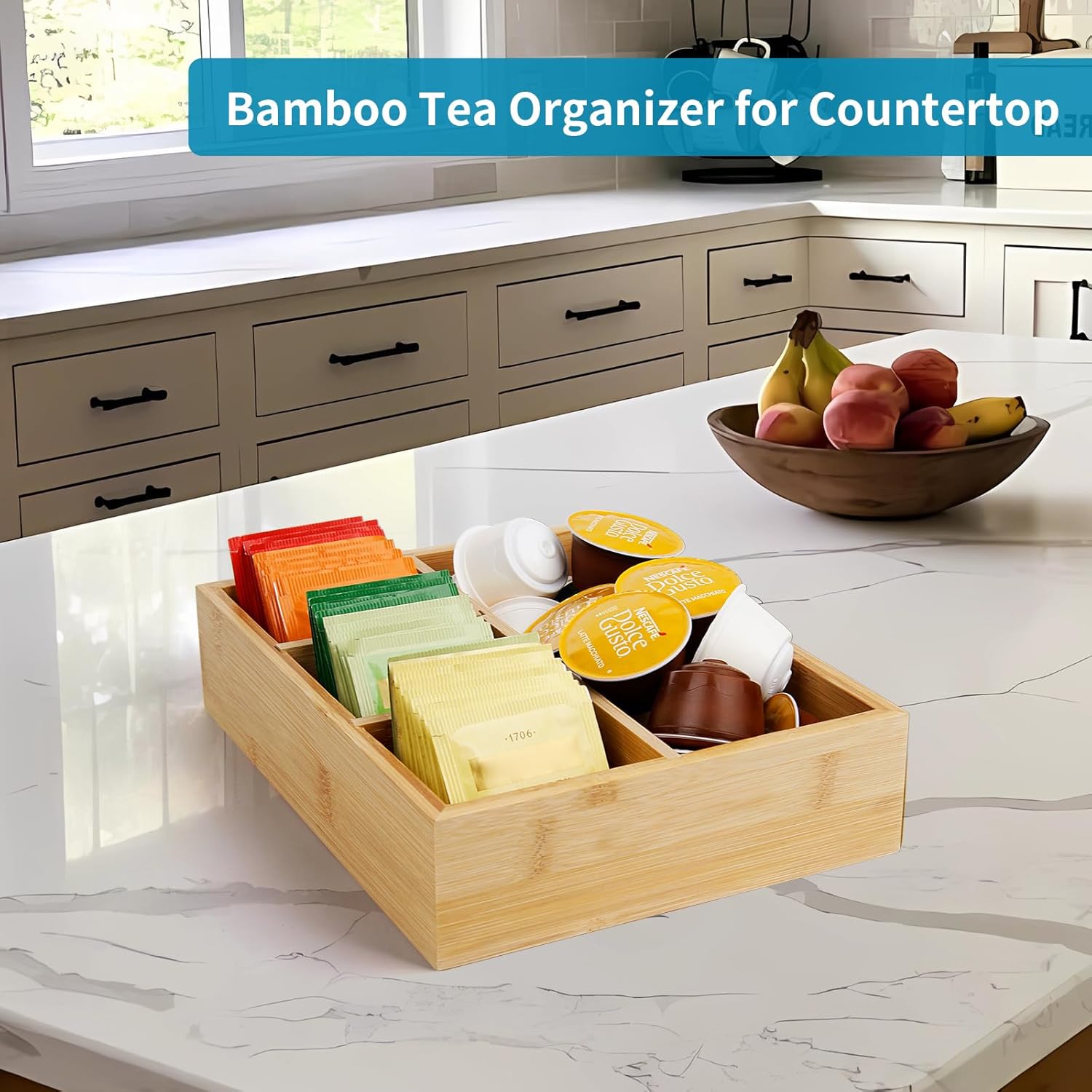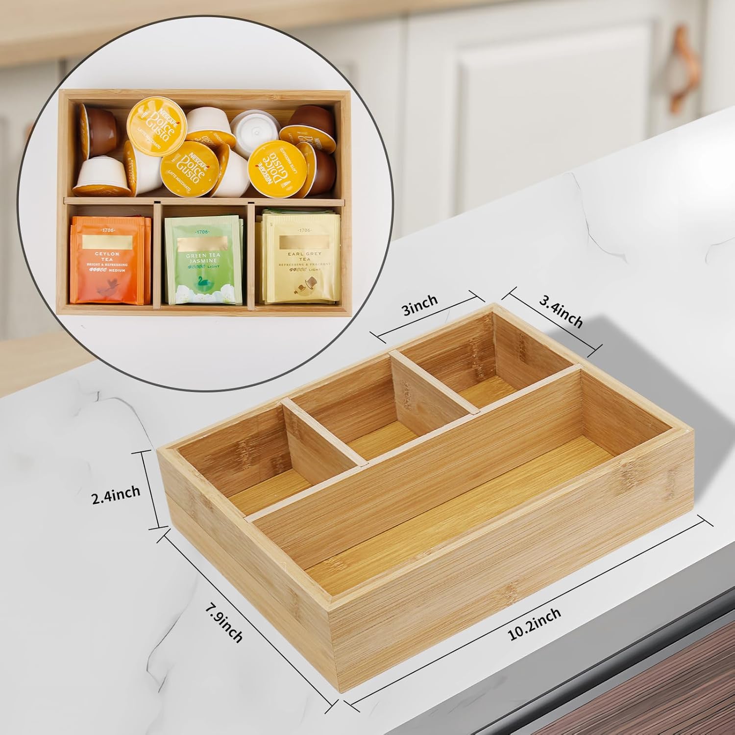- Coffee and Tea Bag Organizer: 10.2 x 7.9 x 2.4 inch, 4 divided sections makes your belongings not only stored, organized but also classified, provide you neat countertop, clean home space and convenient home life, our bamboo holder can be used for storing small tea accessory items such as sugar packets, honey sticks, coffee pods