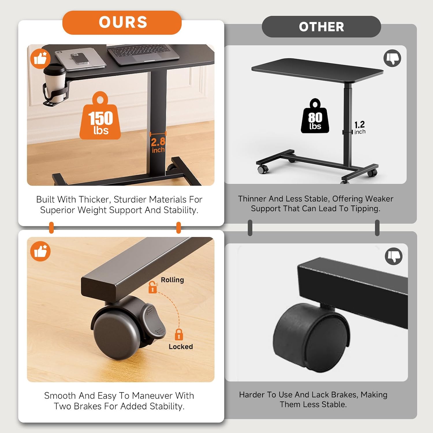 - Convenient Mobility & Space Saving: Designed with four 360-degree swivel wheels, this overbed table moves smoothly across any surface, allowing you to reposition it wherever you need. The standing desk compact design fits neatly under most furniture, making it ideal for small apartments, dorm rooms, or limited spaces