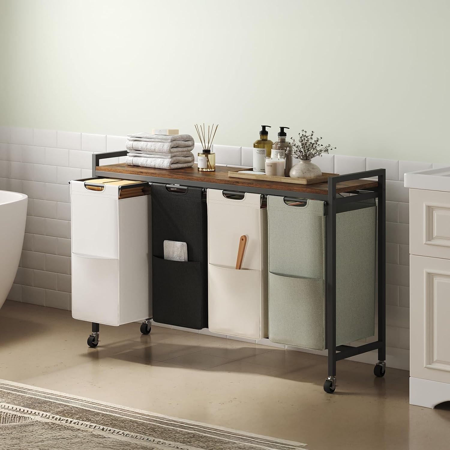 HOOBRO Laundry Sorter 4 Sections, Laundry Hamper with Wheels, 4 × 10.5 Gal (40 L), Rolling Laundry Basket, Pull-Out and Removable Oxford Fabric Bags, Rustic Brown BFE04XY01