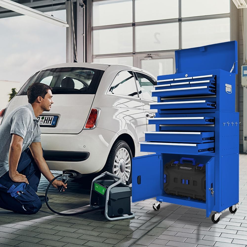 13-Drawer Double Door Rolling Tool Chest, 2 in 1 Detachable Tool Chest,Tool Box with Drawers and Wheels, Large Tool Cabinet with Lock, Metal Standing Toolbox for Garage Workshop-Blue