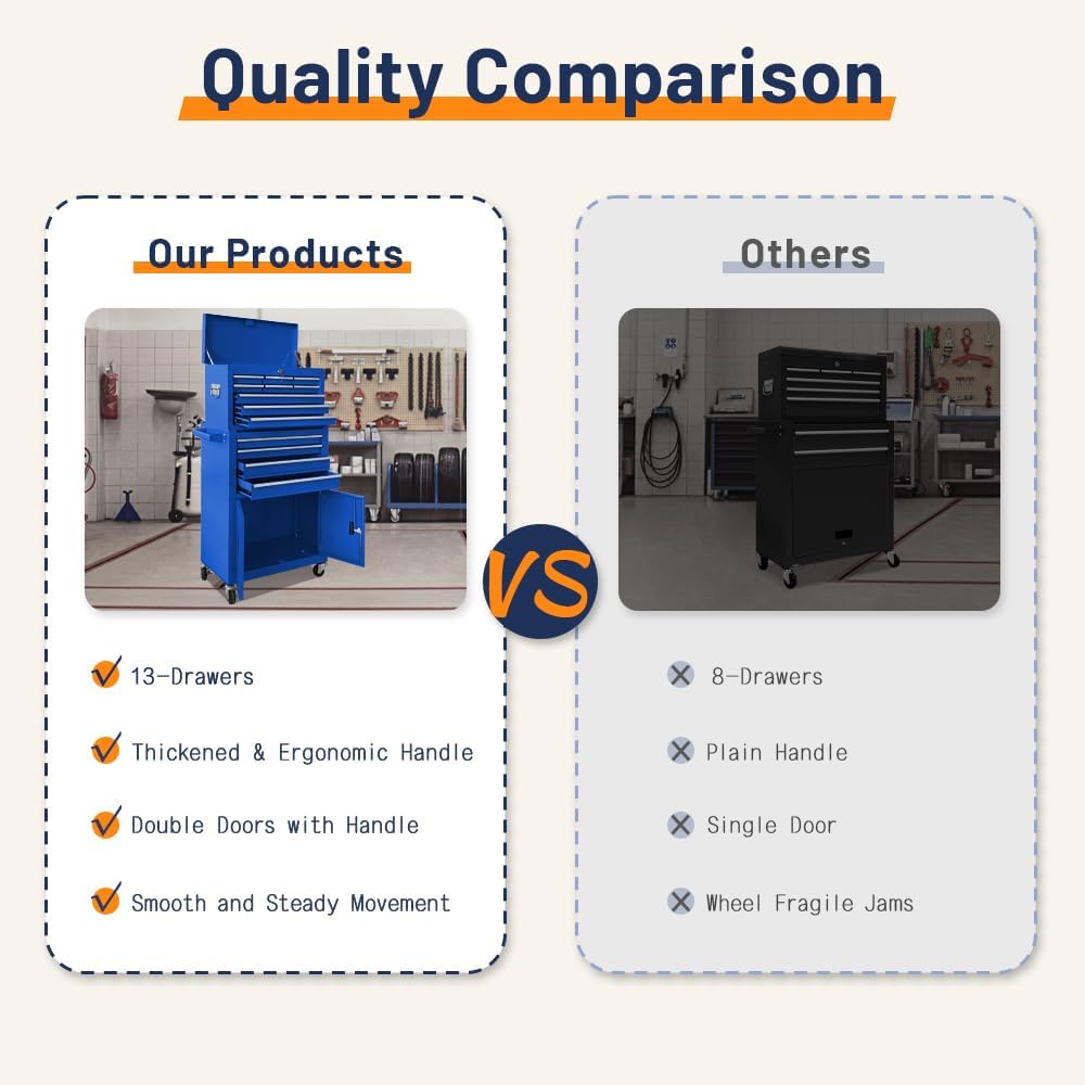 - ăLarge High Capacityă: Our tool chest has 6 hooks beside of cabinet, hanging items.And out rolling tool chest is equipped with 13 sliding drawers: 7 large,6 small,1 top tool chest and 1 bottom cabinet, to store different size tools and meet your needs. Each drawer is designed with liner, avoid scratches.