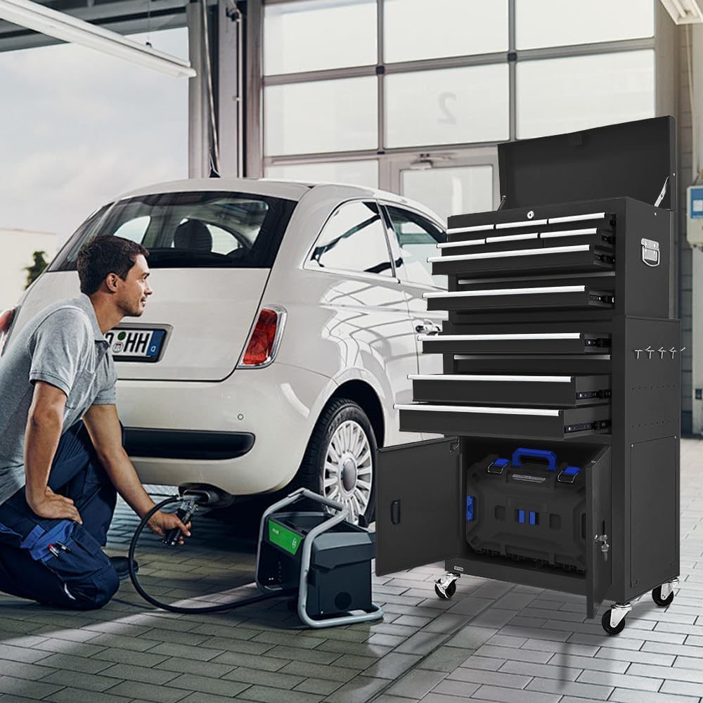 - 【Perfect Material】: Our tool chest is detachable, can be divided into top toolbox and bottom tool cart,with independent locking system.You can use them independently. And the tool box is made of cold-rolled steel material, stable construction, avoid from scratching, denting, chipping, more durable; adopting powder coat, classic black color, beautiful.
