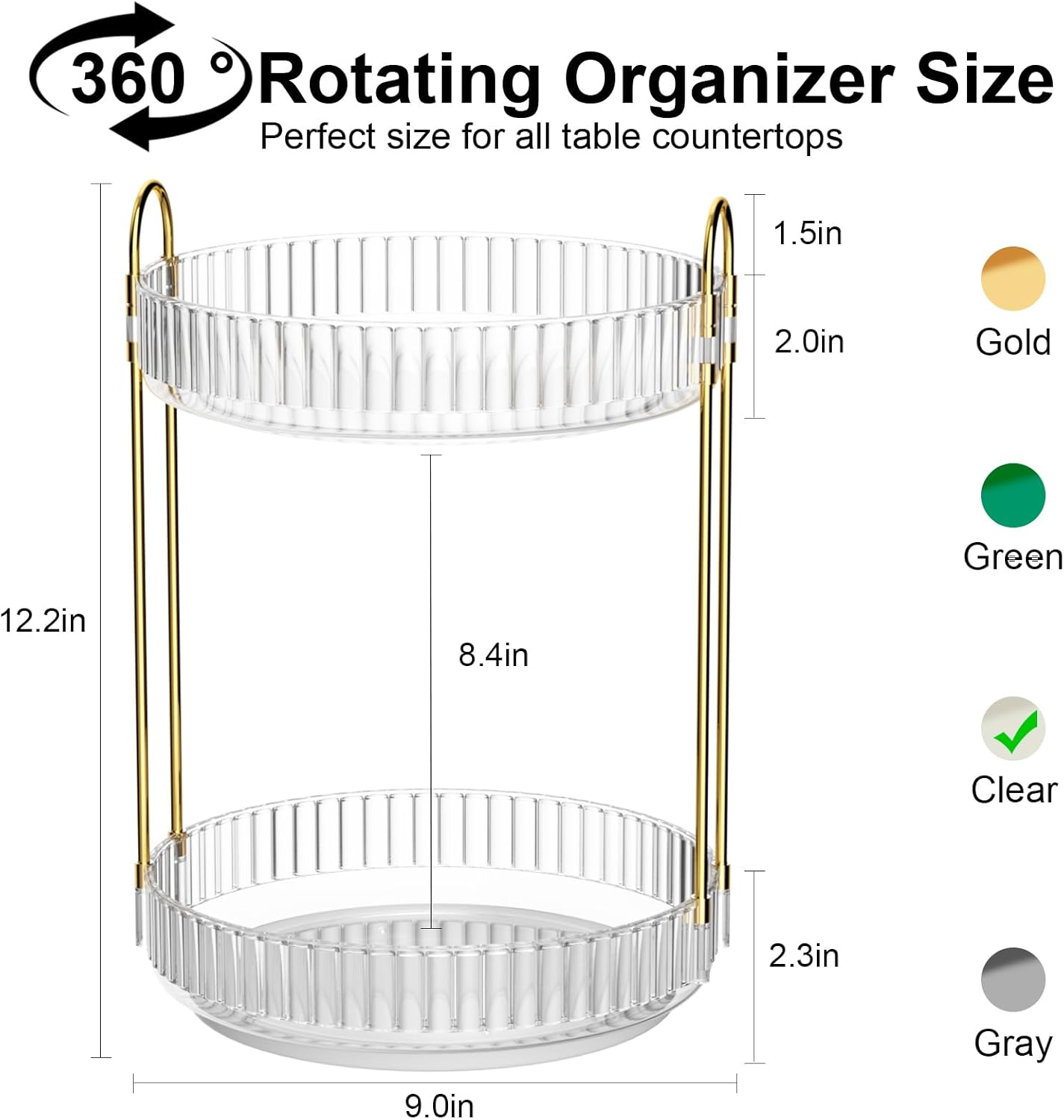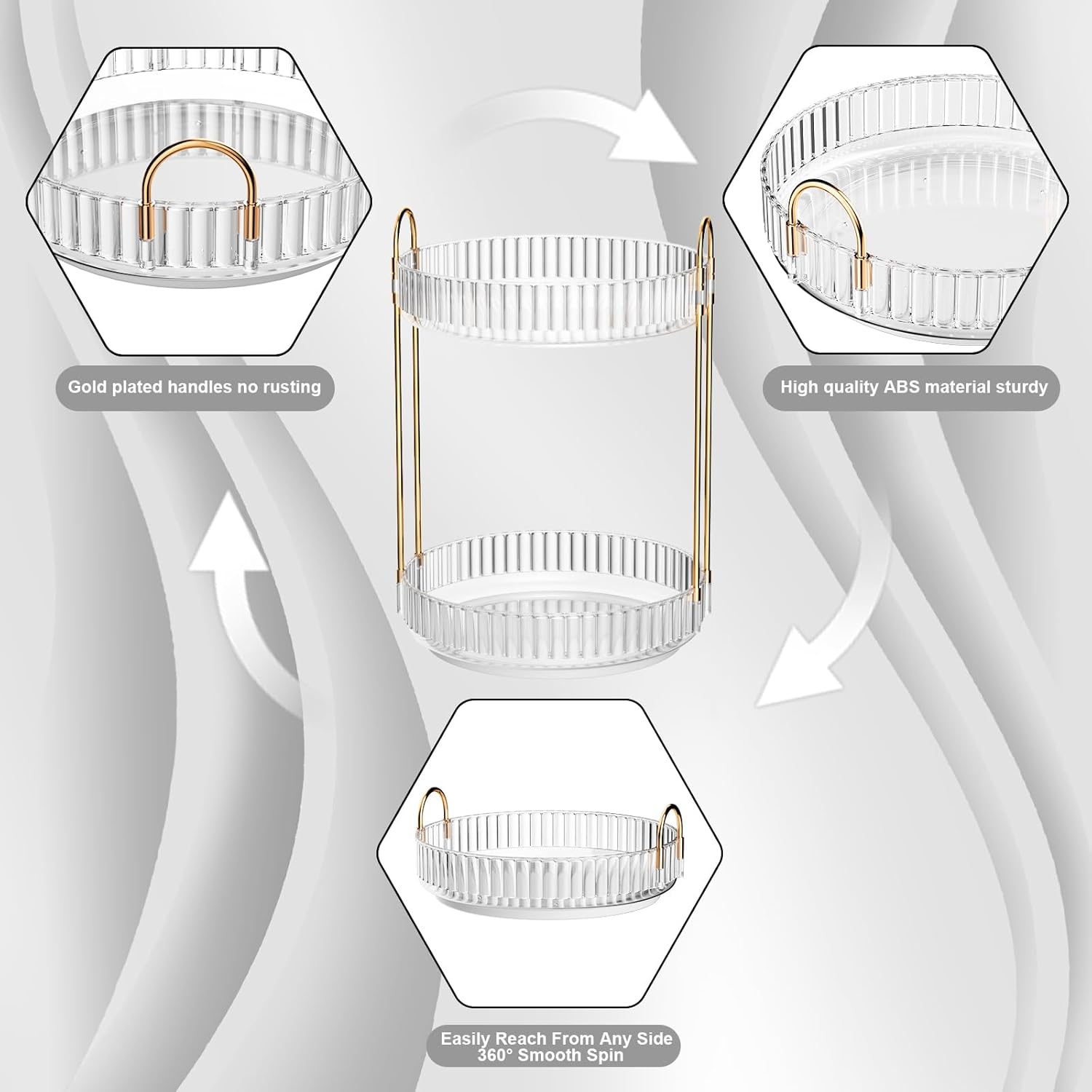 - [360°Rotating Makeup Organizer]- GTI bathroom organizers and storage have large capacity organizers and storage space, and add convenience to the 360° Swirl feature. No need to look for your beauty products in a messy drawer or a scattered desktop. Our makeup organizers can help you easily achieve it with a simple rotation.