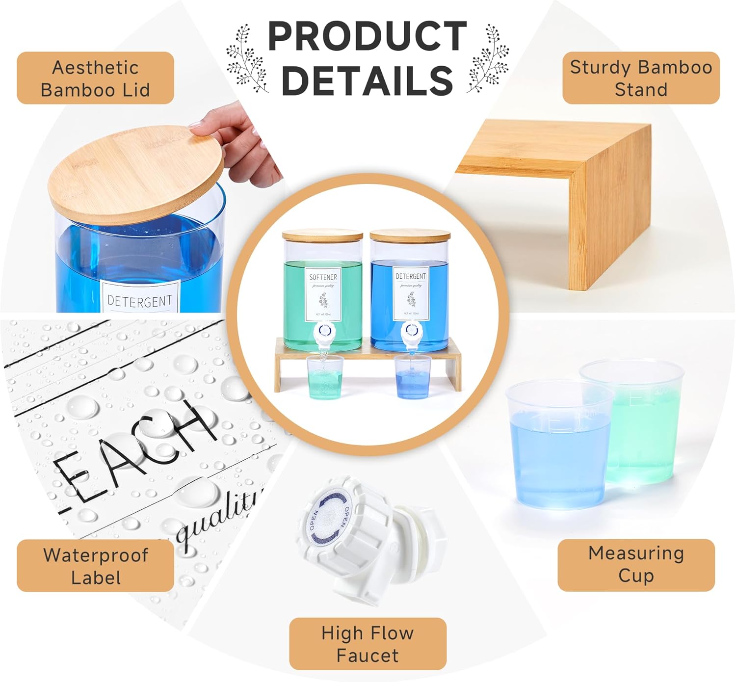 - Premium Glass & Bamboo Design: Glass Laundry Detergent Dispenser with Bamboo Lids and Sturdy Shelf β Made of BPA-free thick glass and sturdy bamboo, this detergent container for laundry room resists leaks, rust, and corrosion. The glass jars for laundry room combine farmhouse elegance with durability, while the bamboo lid storage containers keep liquids fresh and dust-free
