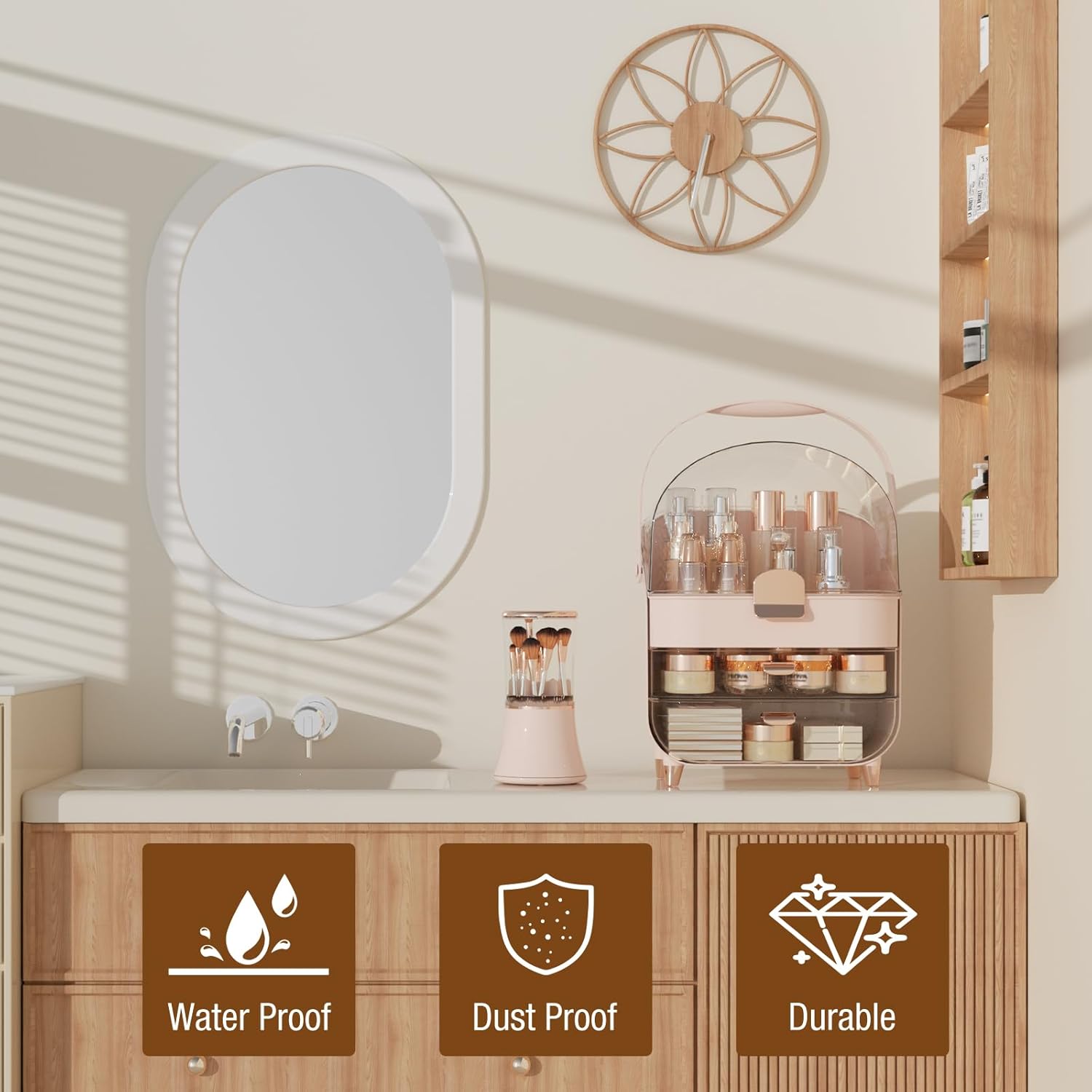 - 🎀Waterproof & Dustproof: Sealed organizer blocks moisture/dust. Safe for bathrooms/vanities—keeps your cosmetics or skincare products undamaged