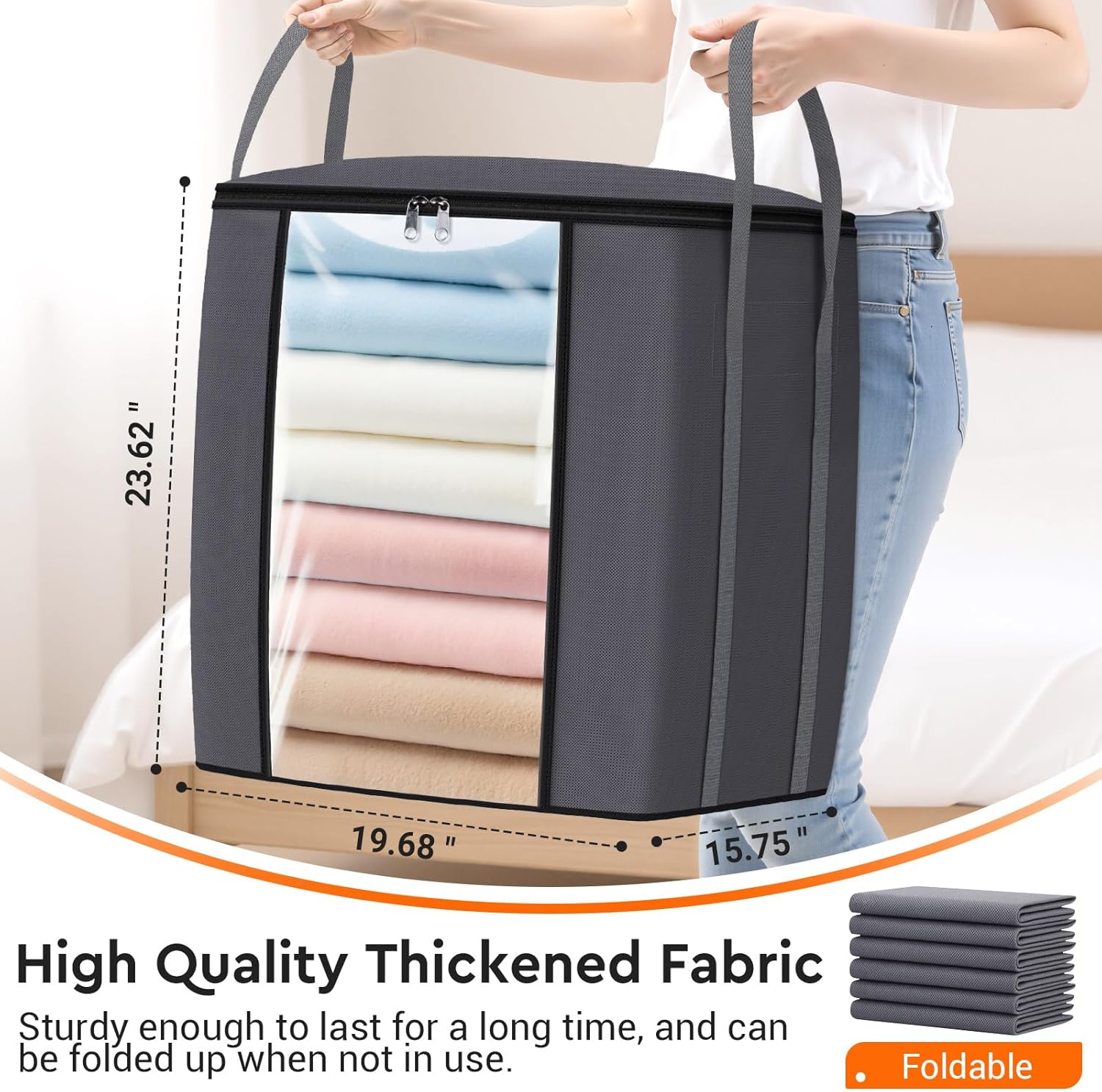 - Extra Large Capacity: TasticTotes 120L clothes storage bag measures 19.7" * 15.8" * 23.6", spacious enough to store your comforters, pillows, bedding, blankets, clothing, sweaters, shoes, etc. Perfect for organizing seasonal bedding or out-of-season clothes at closet, home, nursery, dormitory, bedroom