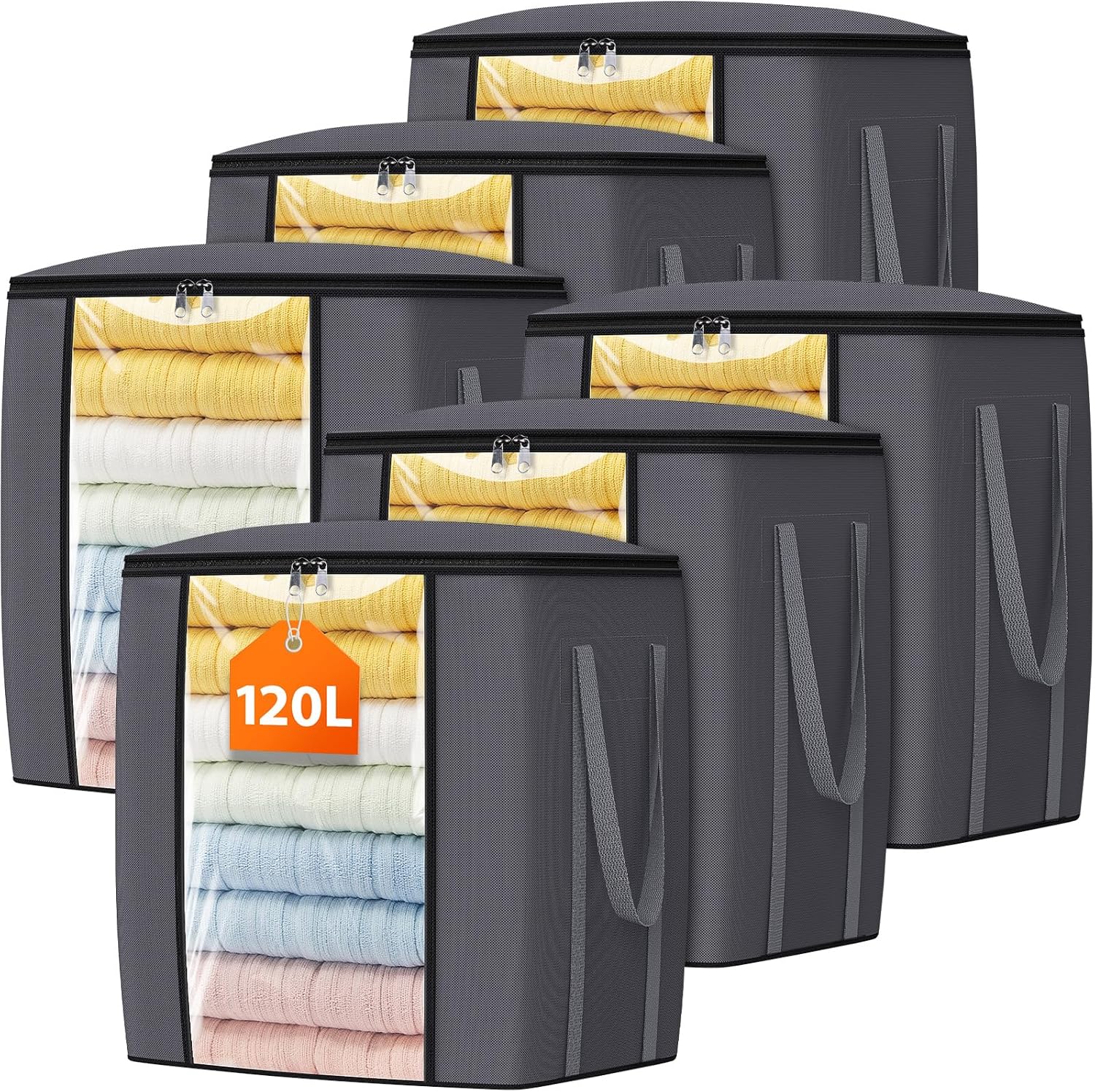 120L Extra Large Clothes Storage Bags, Foldable Blanket Storage and Organization, Thick Fabric Containers with Reinforced Handles & Zippers for Clothing, Comforters, Bedding, Gray, 6 Pack