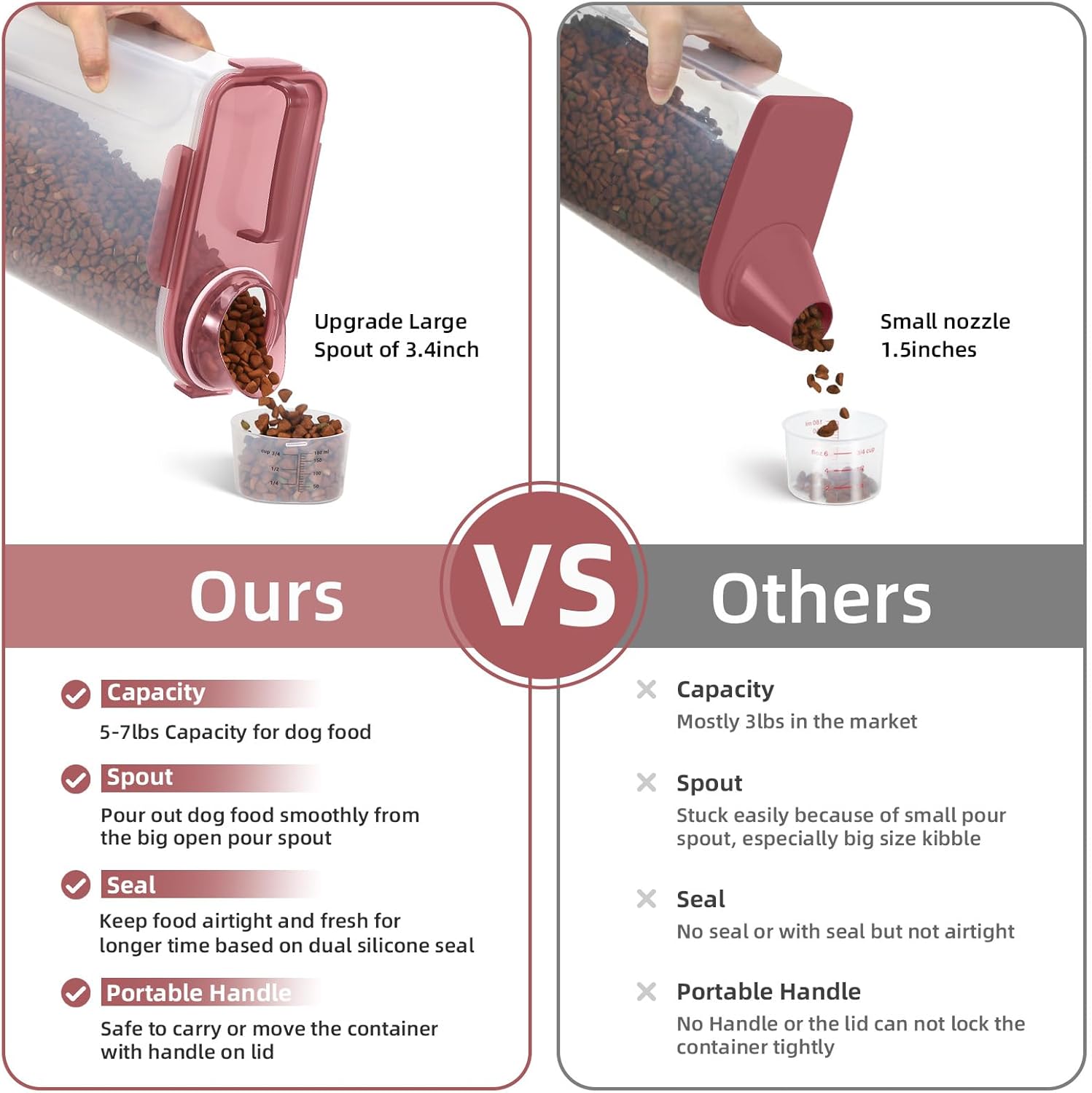 - WHAT YOU GET ? The dog food storage container comes with a 1-pack airtight pet food storage container with a clear measuring cup and an upgraded large spout for easy pouring of pet food at any time. This dog food storage containers can be a gift The perfect gift for any home.