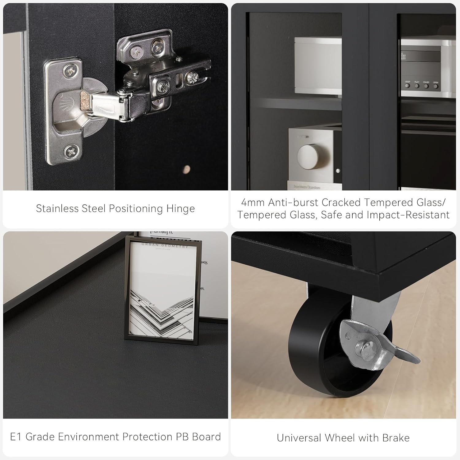 - Upgraded Quality AV Cabinet with Glass Doors: The AV cabinet's door is made of a combination of wood and 0.16" explosion-proof tempered glass, ensuring safety and durability. It allows you to store your items while still providing visibility for display purposes. The tempered glass is resistant to impact and dust, making it easy to observe without affecting the remote control signal. In the unlikely event that it breaks, there is no risk of getting cut