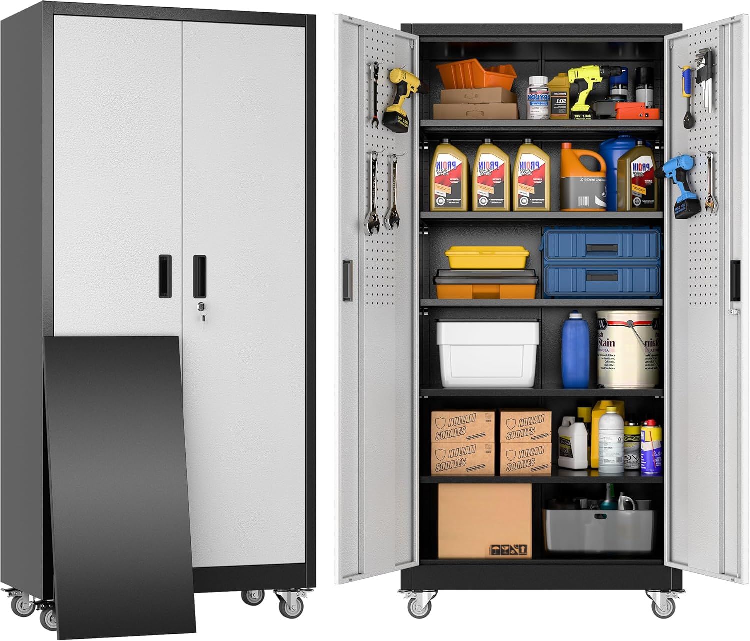 - ăUtility Pegboard & 5 Adjustable Shelves ăRedesign your organizing ways, hang up everything on the door, get effortless accessible for a variety of small hardware, no more searching for things among the clutter. Tall garage storage cabinet with wheels is designed with 5 adjustable shelves, you can easily meet your different storage needs by adjusting the height between the shelves.