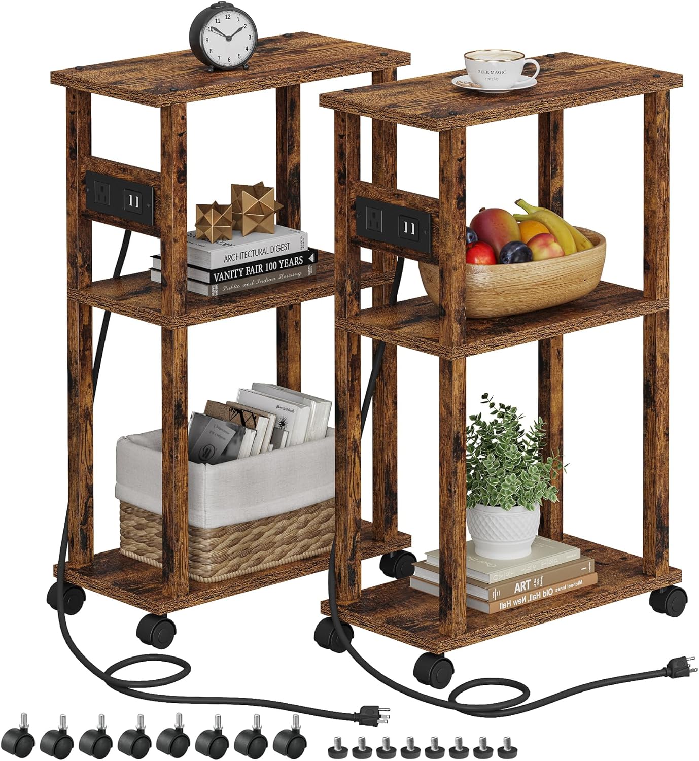 TUTOTAK Small Narrow Side Table with Charging Station, Skinny End Table for Small Spaces, Slim Nightstand with USB Ports and Outlet, Sofa Beside Table with Wheels, Rustic Brown TB01BB047C
