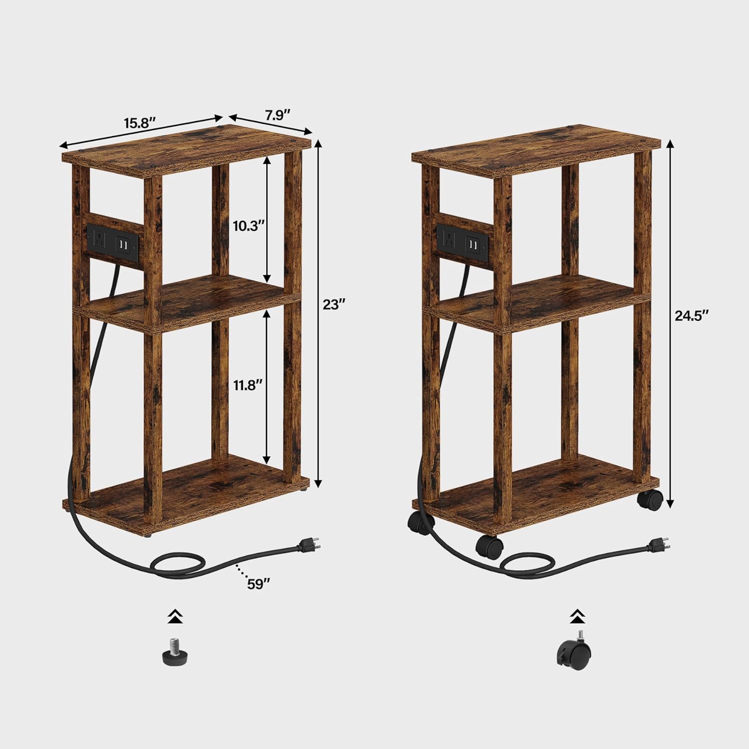 - [3-Tier Storage for Small Space] Size: 7.9βD x 15.8βW x 23βH or 24.5βHοΌwith wheels), 7.9β width, this industrial side table is perfect for small spaces as a sofa end table, nightstand put in the corner and small spaces, the beside table not very spacious but still has enough space to add a lamp, photo frame, coffee and magazines in the top panel, and you can charge your phone or tablet by placing it on the second layer board and you also can put storage basket on the bottom board.