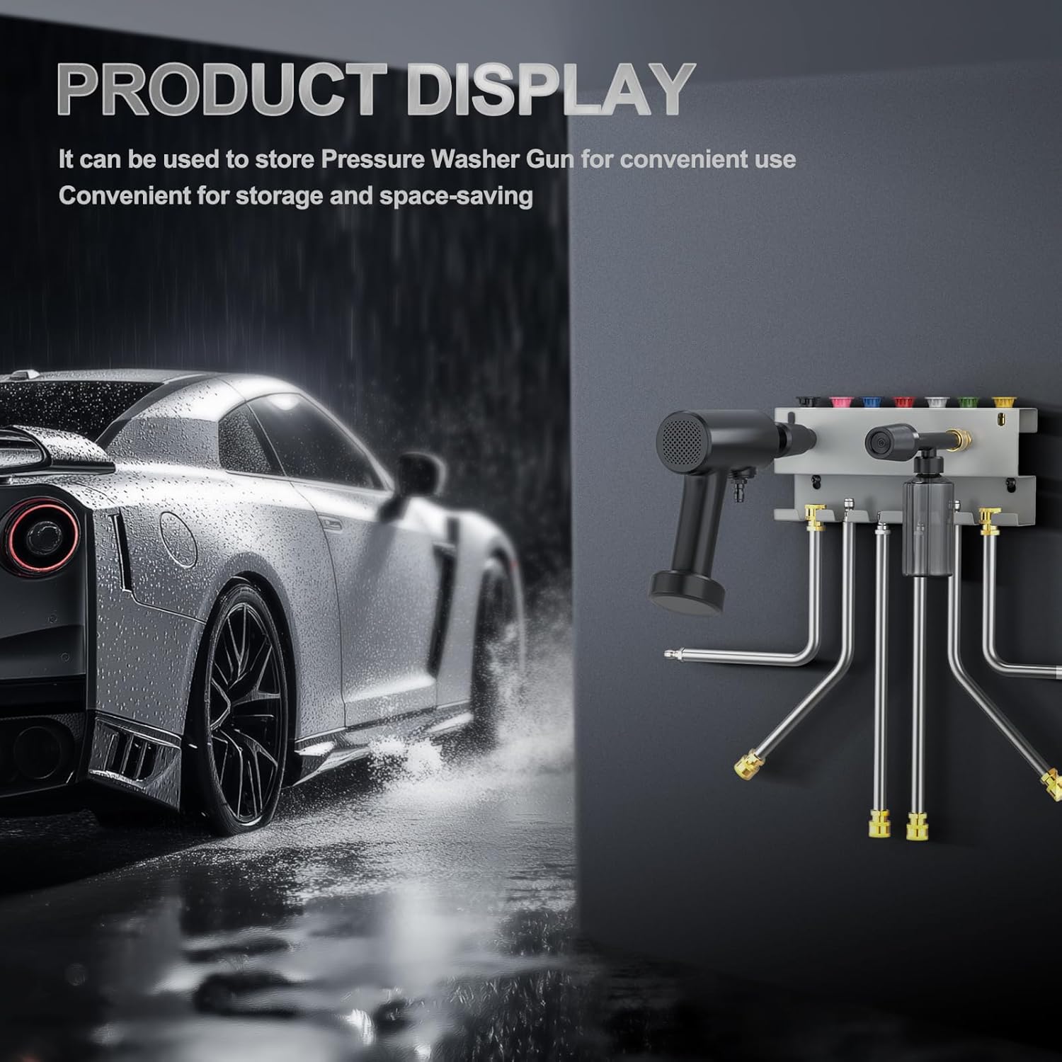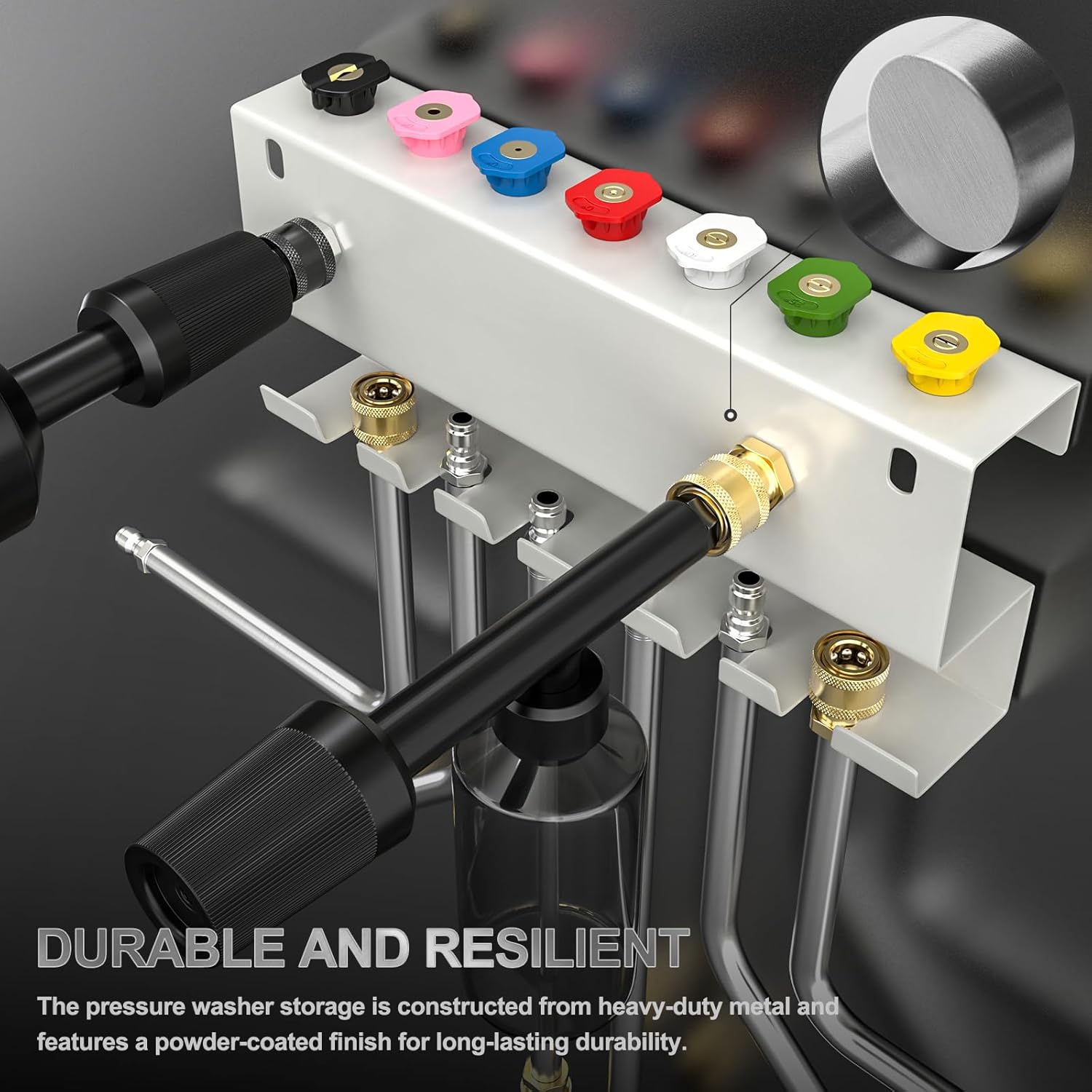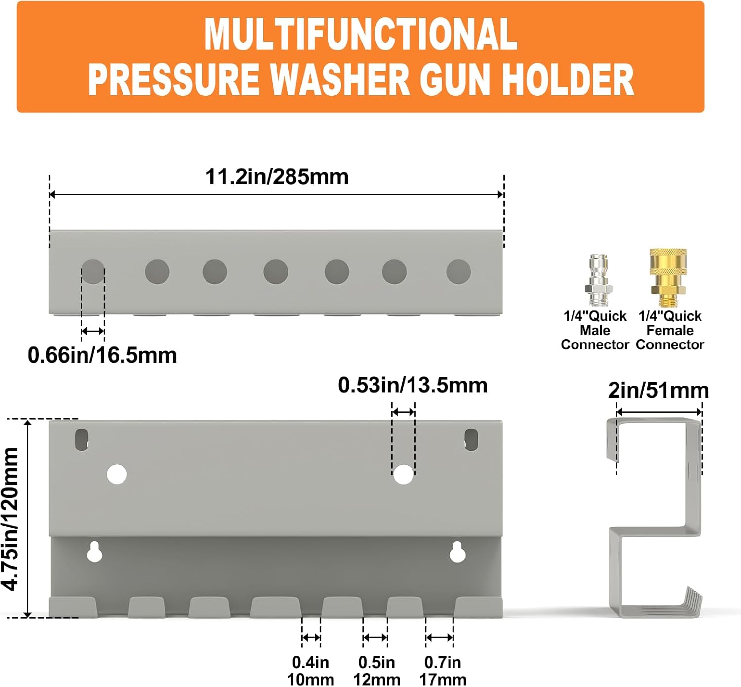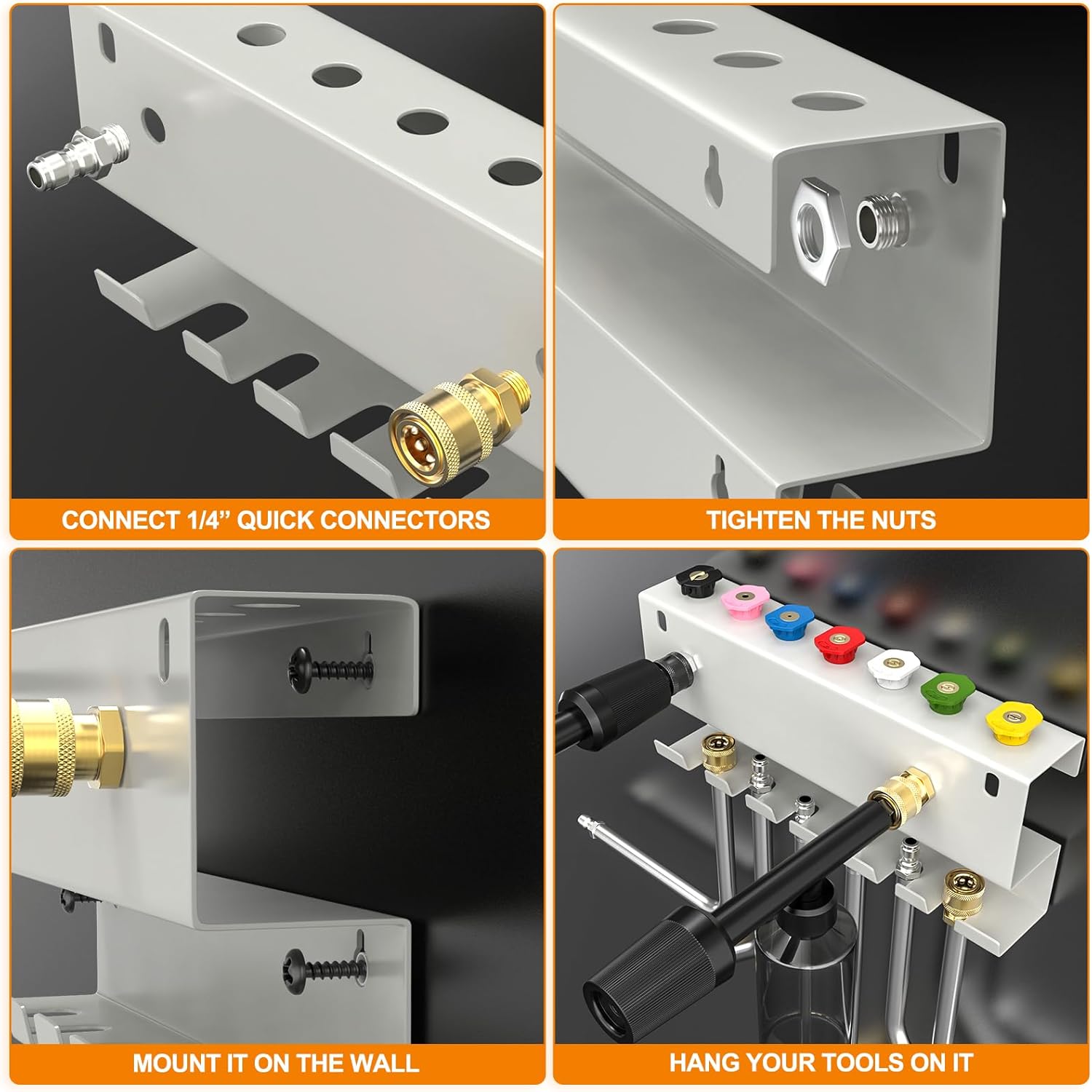 - A versatile and compact pressure washer accessories rack, It Come with 1/4 inch quick connect male and female fittings, hold up pressure washer gun, foam cannon, nozzle, and wand extension wand simultaneously.