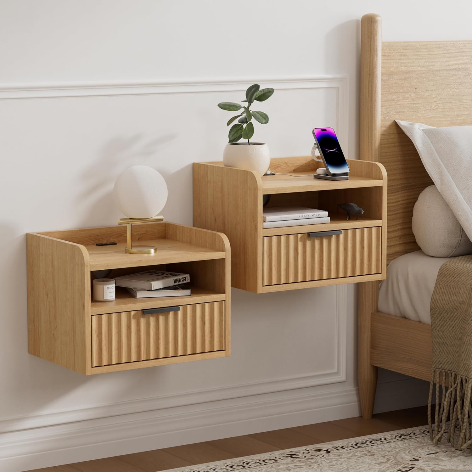 Fluted Floating Nightstands Set of 2 with Drawer, Modern Small Wall Mounted Storage Night Stand with Charging Station, Wood Bedside Table USB C & USB A Ports, Natural Oak