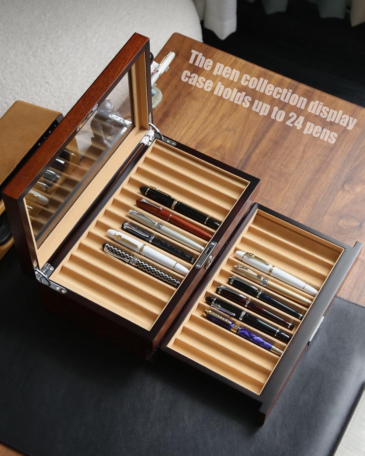 - The pen collection display case holds up to 24 pens .The pen storage has two finishes, black and dark brown, to suit numerous interior styles.wood pen display are designed to store your precious pen or for a growing collection that allows you to proudly display and organize your favorite pens and accessories.Tastefully protects, stores, and organizes up to 24 of your pens.Luxury pen box with a glass window.You'll love looking at your collection of pens neatly displayed in this fine box.