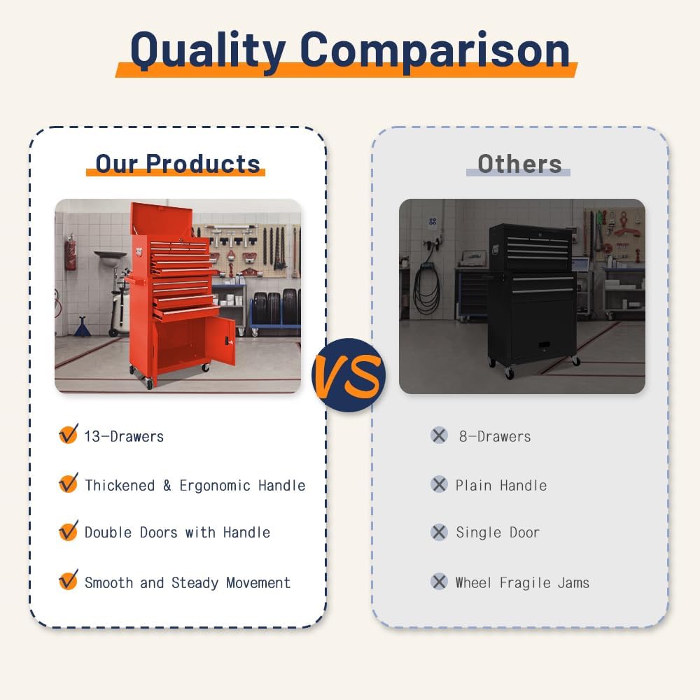 13-Drawer Double Door Rolling Tool Chest, 2 in 1 Detachable Tool Chest,Tool Box with Drawers and Wheels, Large Tool Cabinet with Lock, Metal Standing Toolbox for Garage Workshop-Red