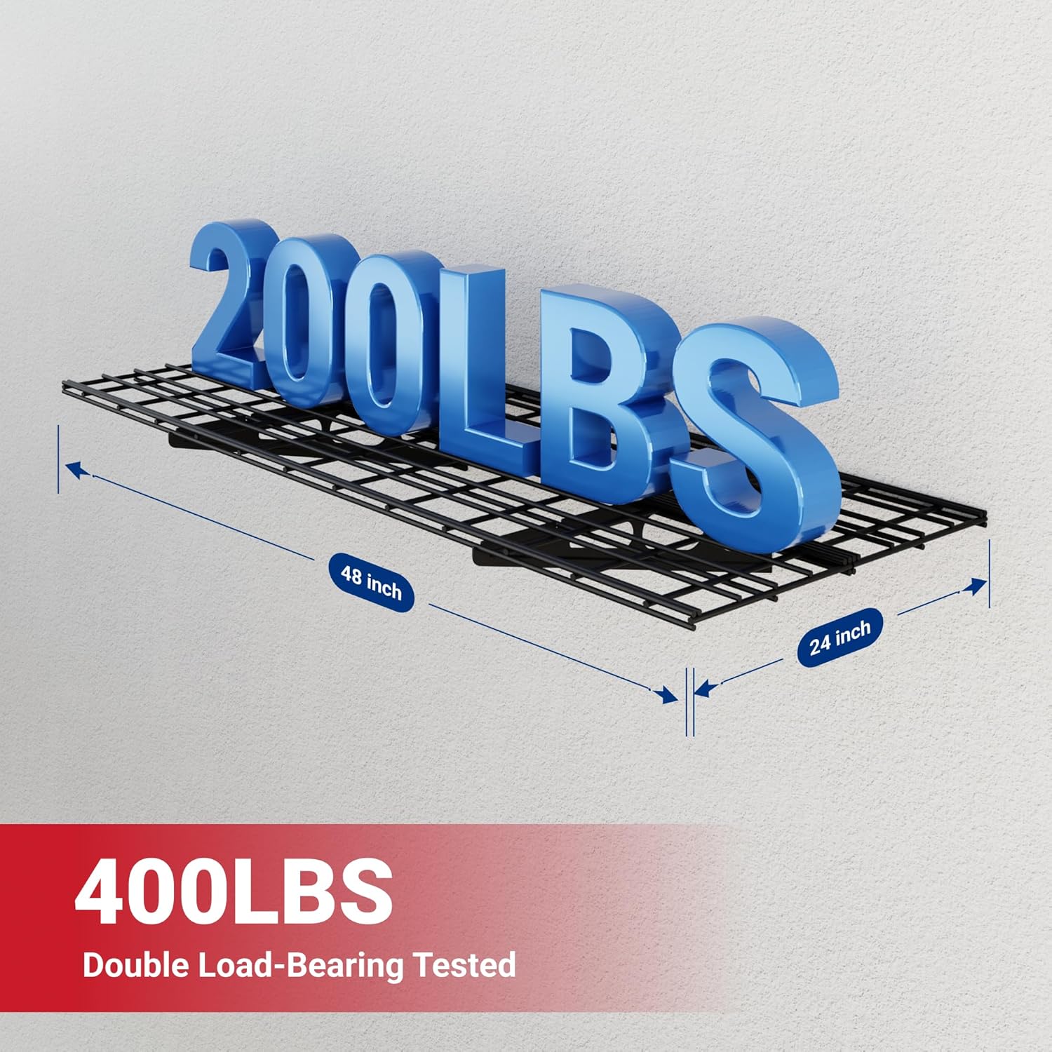 - 400 lbs Tested, 200 lbs Total Rated Capacity: Our garage wall shelving unit has been rigorously tested with a total weight capacity of 400 lbs, ensuring unparalleled safety and durability. It has a total rated capacity of 200 lbs, with each individual unit capable of holding up to 200 lbs.